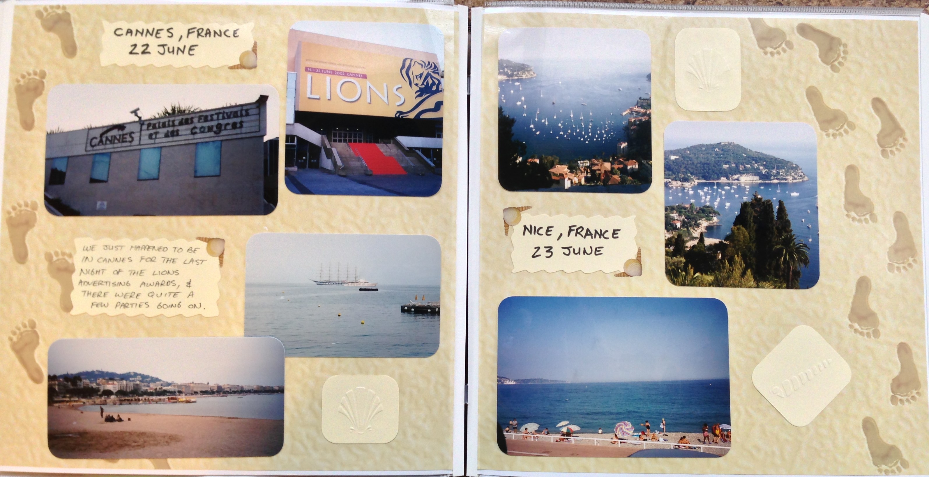 After our short few days in Barcelona, we headed back into France to visit Cannes and Nice, France. As I look back on this page I don’t find it particularly inspiring, but it does show a new technique that I started to use – using a round corner cutter to round the corners of the pictures. This is a technique that I use often now as I think it softens the design. You can see that I used it on the embellishments as well to create consistency.