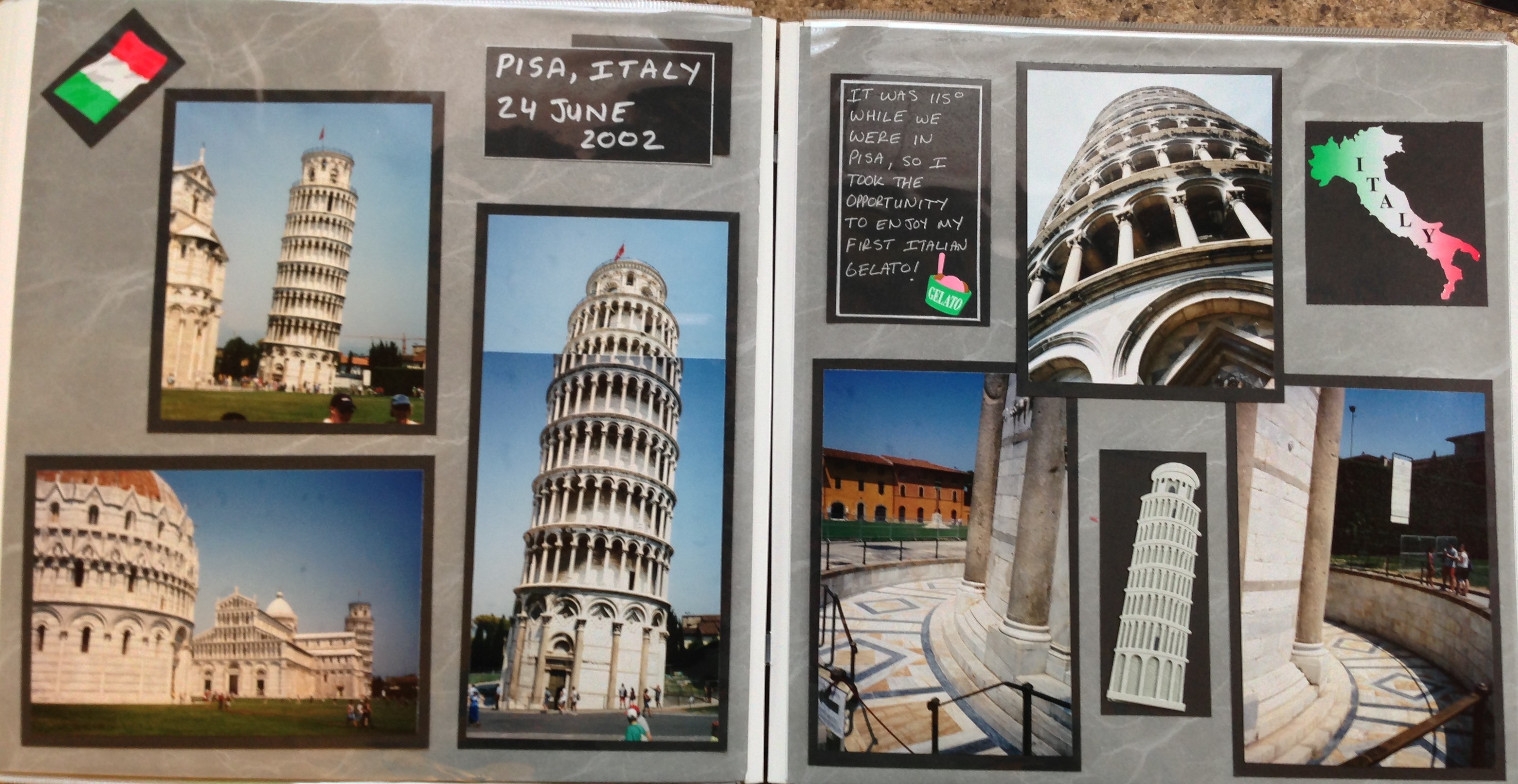 The next country that we visited was Italy, and we started in Pisa. It was 115 degrees that day! I want to highlight a couple of techniques that I used on this page that are unique or were new to me at the time. The left page shares two views of the Leaning Tower of Pisa. The reason that I did this was that I wanted to have a closer view and one from a little further away. I took these three pictures while walking towards the Tower. If you look closely at the right picture on the left page you will notice a color change in the sky. This is because I actually spliced two pictures together to create that closer view. With today’s new digital cameras they can actually do this while you are taking the picture, or at least can do it afterwards on your computer. But this is a technique that you can still choose to use if you didn’t quiet get the shot that you were hoping for.