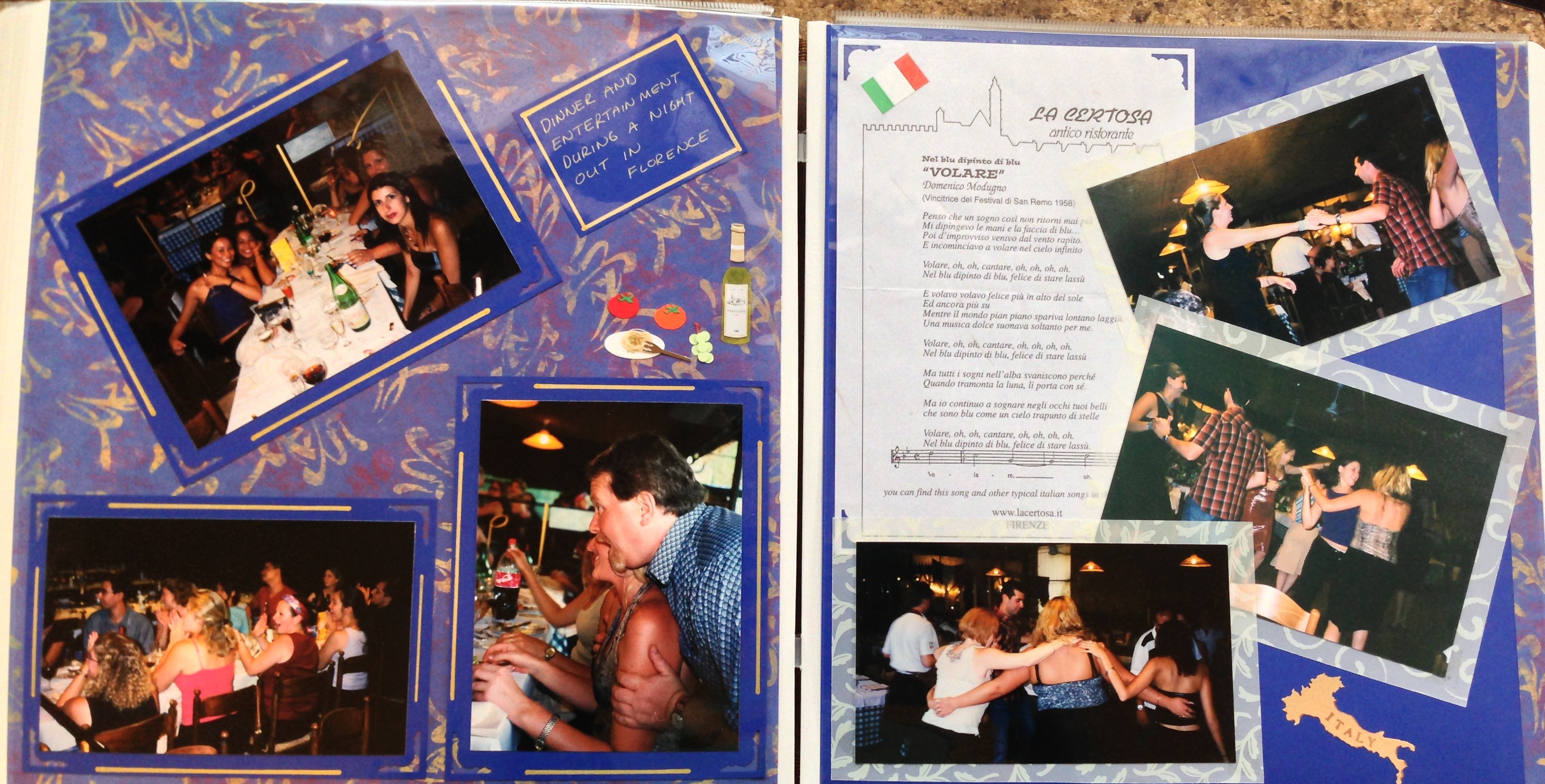Our last night in Florence, Italy we went out to a fun restaurant, La Certosa, complete with wandering singers who sang love songs to some of the women in our group :). Some new techniques that I used on this page were to use photo corner cuts on the borders of the photo graphs as well as to add dimension to the borders on the left side photos with a gold marker. I also did something that I do not do very often – use the corner cut on the song sheet from the restaurant. I usually do not modify ephemera as I am afraid I will make a mistake and ruin something that I cannot replace. Now I usually try to collect more than one when I travel so that if I make a mistake I have a backup.