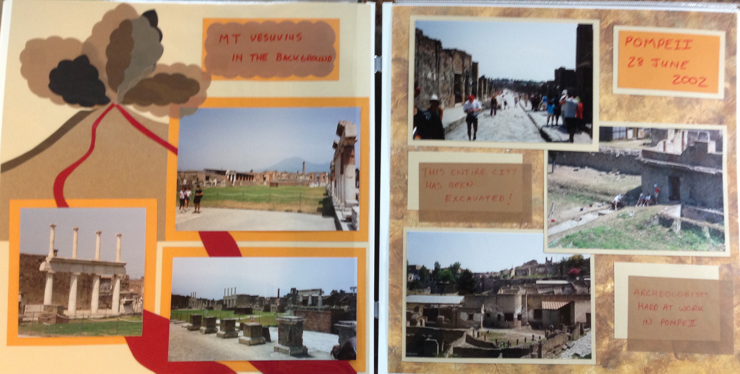 What I am most proud of on this set of pages is the handmade background that I made on the left page. I created Mt Vesuvius from color papers and then ran rivers of red lava down the side of the mountain. Some of the ash clouds are made of vellum, a paper that is transparent and can be found in many different colors. I had fun running the lava between the pictures and their borders as this helped it to stand out much more than when I tried laying it under the borders. I also journaled on vellum on the right hand side. Vellum can be hard to stick on your page because you can usually see the sticker or glue that is used to hold the paper in place. In this case I used an invisible double sided tape to hold the vellum in place. I have also used spray adhesive to affix vellum before but I find that the spray adhesive is best used outside so not to make everything else around your project sticky.
