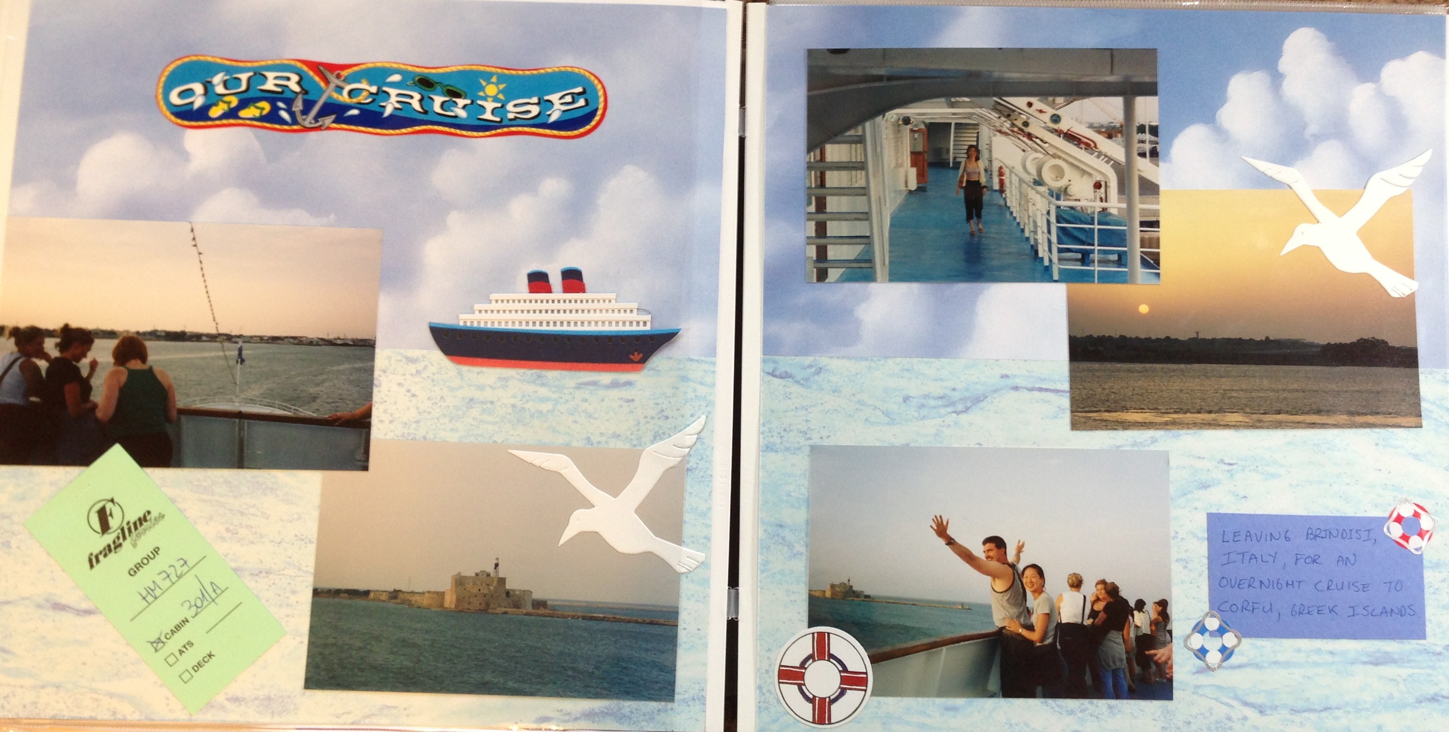 After visiting Pompeii we boarded an overnight Ferry in Brindisi, Italy which took us to Corfu, in the Greek Islands. This page doesn’t really stand out, but I did use a technique that was new to me. You will notice the cruise ship on the left hand page and it looks like it is riding on the ocean’s horizon on the background paper. The way that I created this was to take one page of clouds and one page of waves and cut each in half. Then the two halves were pasted next to each other to create the effect of the horizon. You will have to excuse the crazy “Titanic” pose on the right hand page – I don’t know what we were thinking but we were having fun.