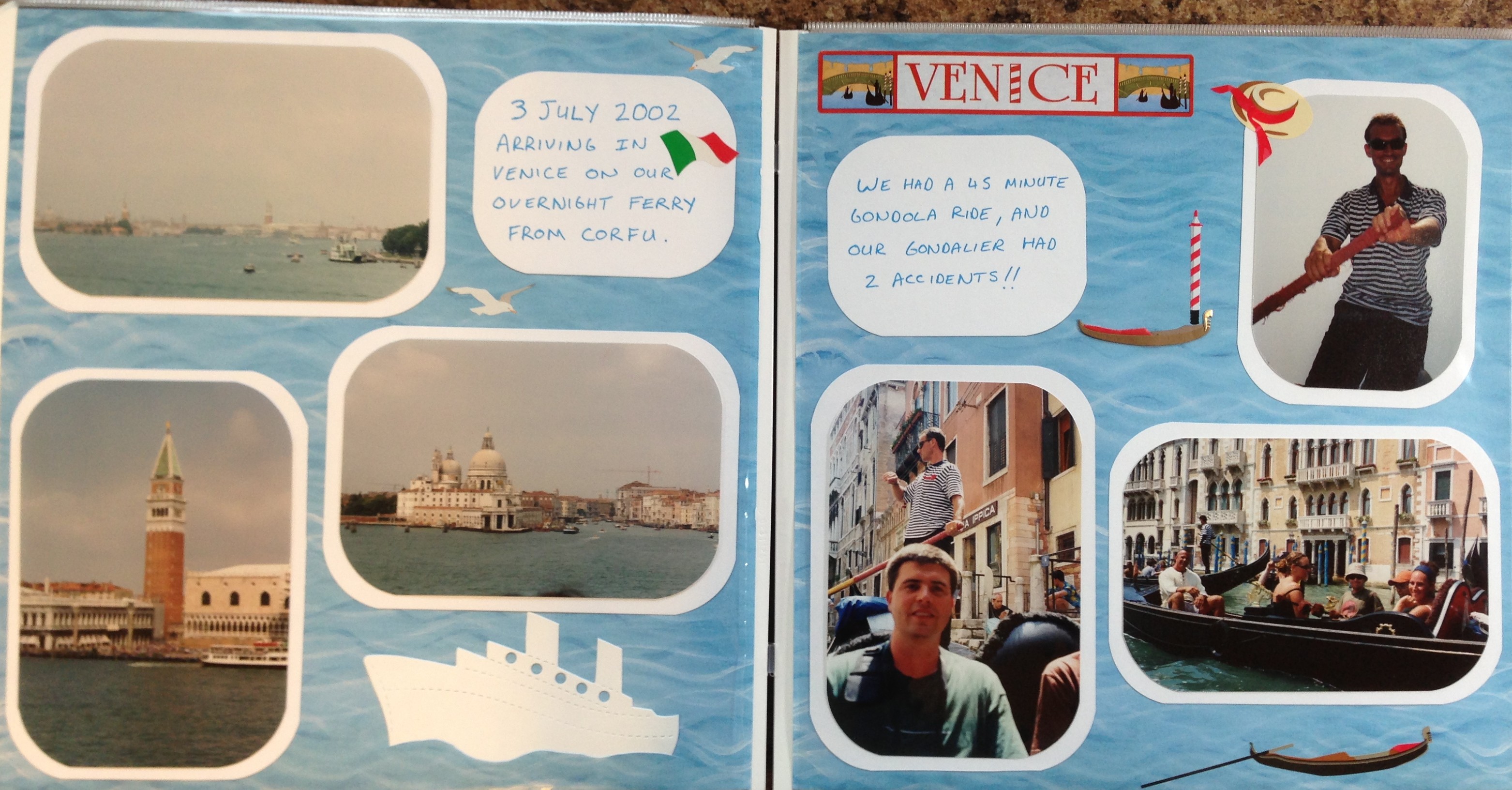 The theme of this spread is twofold. The first is that it is all on water and so I used a water background for both pages. The other is more subtle. A gondoliers traditional uniform is the blue and white striped shirt – so I bordered each photograph with a white border to hint at the theme. I used a corner cutter to round both the photograph and the white border.