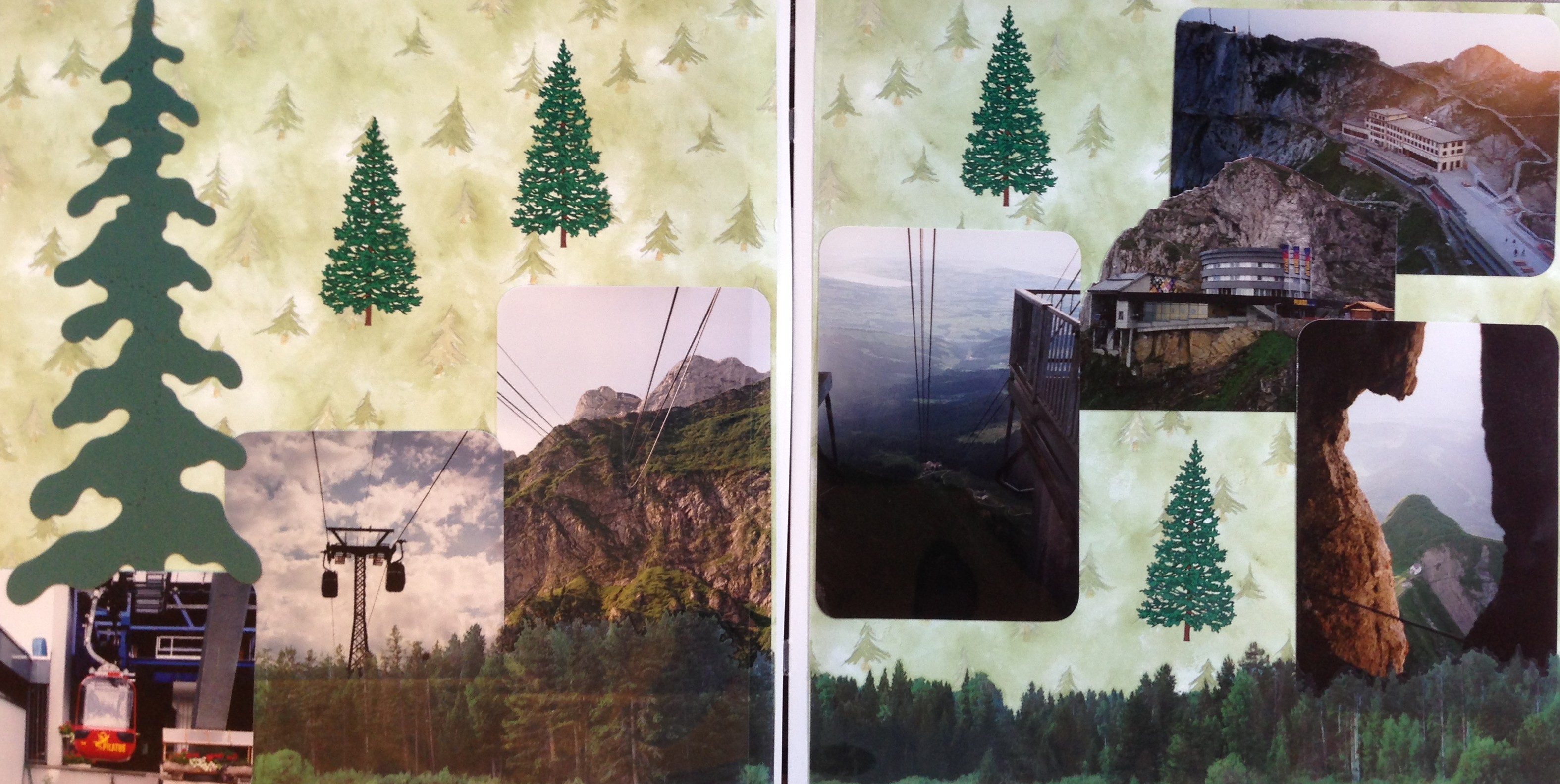 The journey to the top of the mountain took 1.5 hours and we had to change trams part way through the journey. I placed the photos from the bottom left to the upper right to give the impression of the height of the mountain. I used a pre-made tree border at the bottom of the spread and actually covered some of the pictures. This was what a good portion of the ride felt like as we were surrounded by trees. If you look at the right hand side you will see two Hotels. The top one is the one that we stayed in which was the original hotel. Queen
