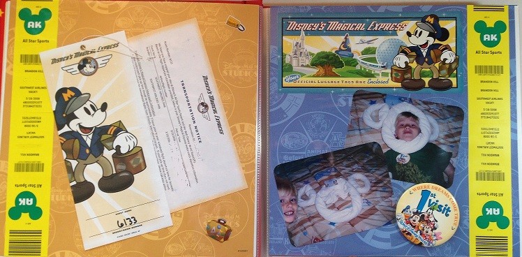 I was so impressed with the Disney Magical Express that I wanted to scrapbook the ephemera from it. Notice that I created side borders with the extra luggage stickers that were provided to us.