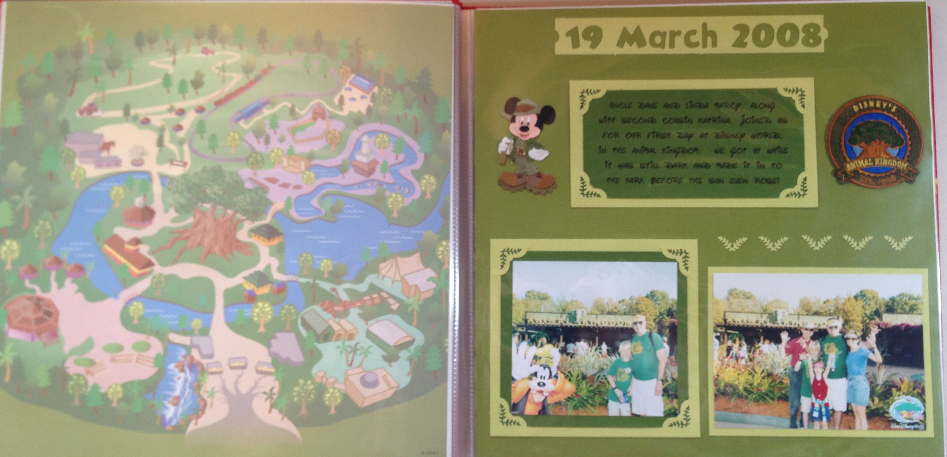 On this spread the left hand page is straight from the Disney paper pack without anything added – I did this as this page serves as a wonderful map of the park as you peruse the following pages. I also used an Animal Kingdom patch on the right hand page.