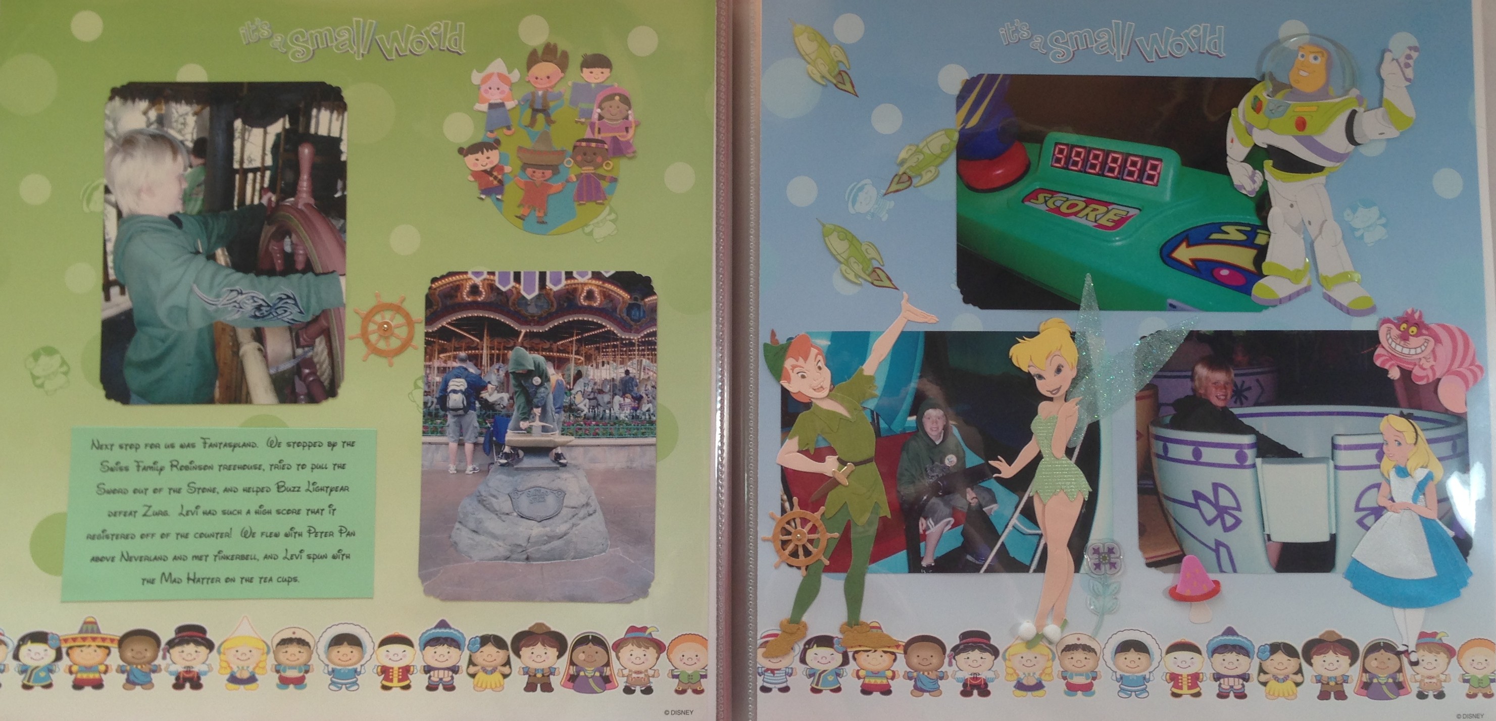 I was trying to figure out how to showcase six different rides from this part of the park all on the same spread when I can up with the idea of using just single pictures from each event. I was fortunate enough to be able to find 3-D stickers for each of the rides to use, and I found “Its a small world” paper to tie the rides together. You will notice that I placed the stickers right over the photographs. Be careful if you do this as you will not have opportunity to reposition them if you make a mistake. This is usually true with most stickers, but when putting them on top of photographs it is doubly true.