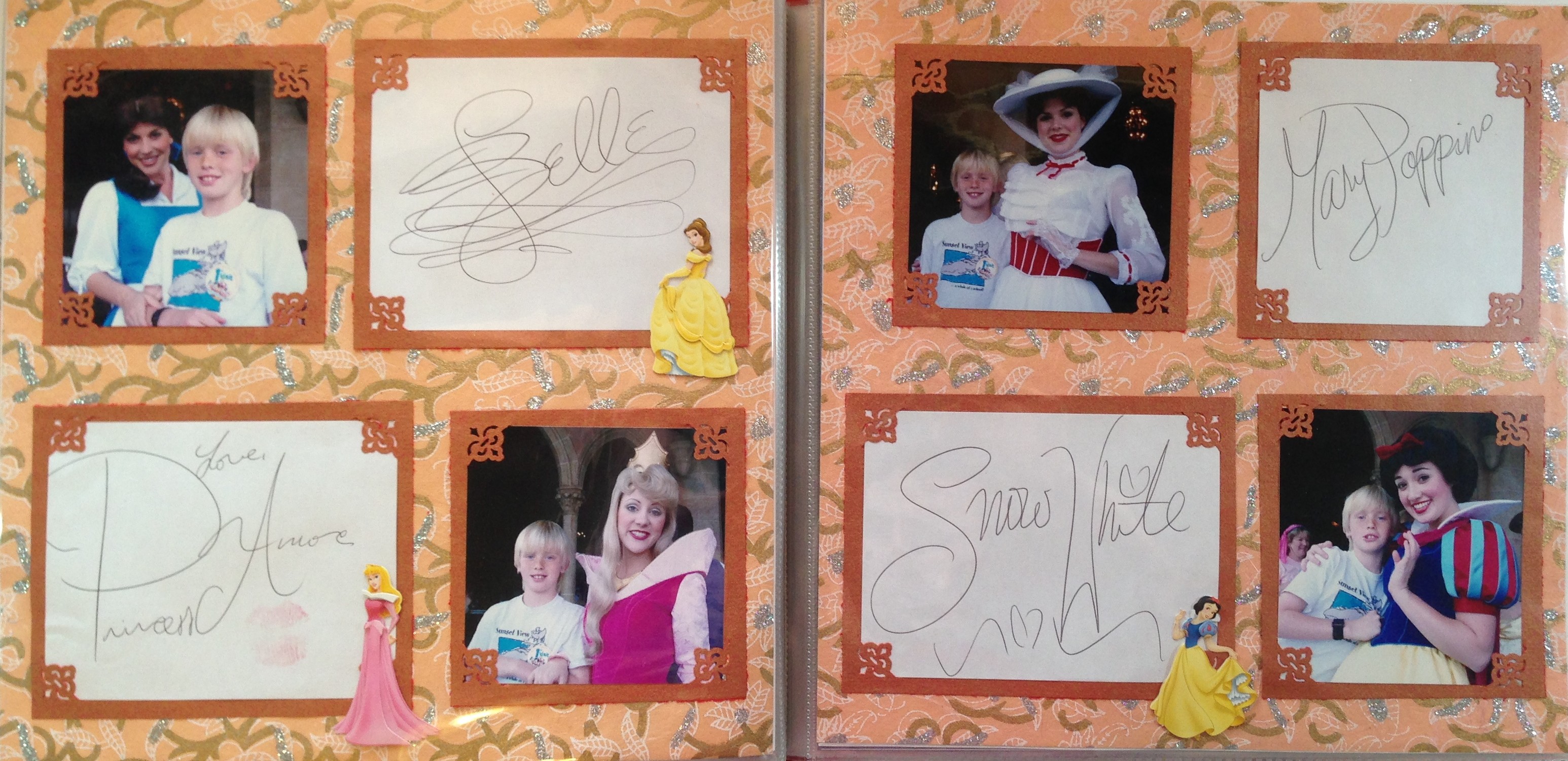 So – this page isn’t very masculine either – I had to make the best of a very pink and feminine event! If you look to the spread above you will notice that there is a large folder on the left hand page. It is actually a picture folder, and if you look below you can see what it looks like open. On the right hand page, bottom left, you will notice an invitation from Cinderella. This was actually on the back of the picture folder and I carefully removed the photograph, cut it out, and then put the photograph back in place so that you can’t tell this was done. I also included the autograph that my son got from Cinderella while at the meal.