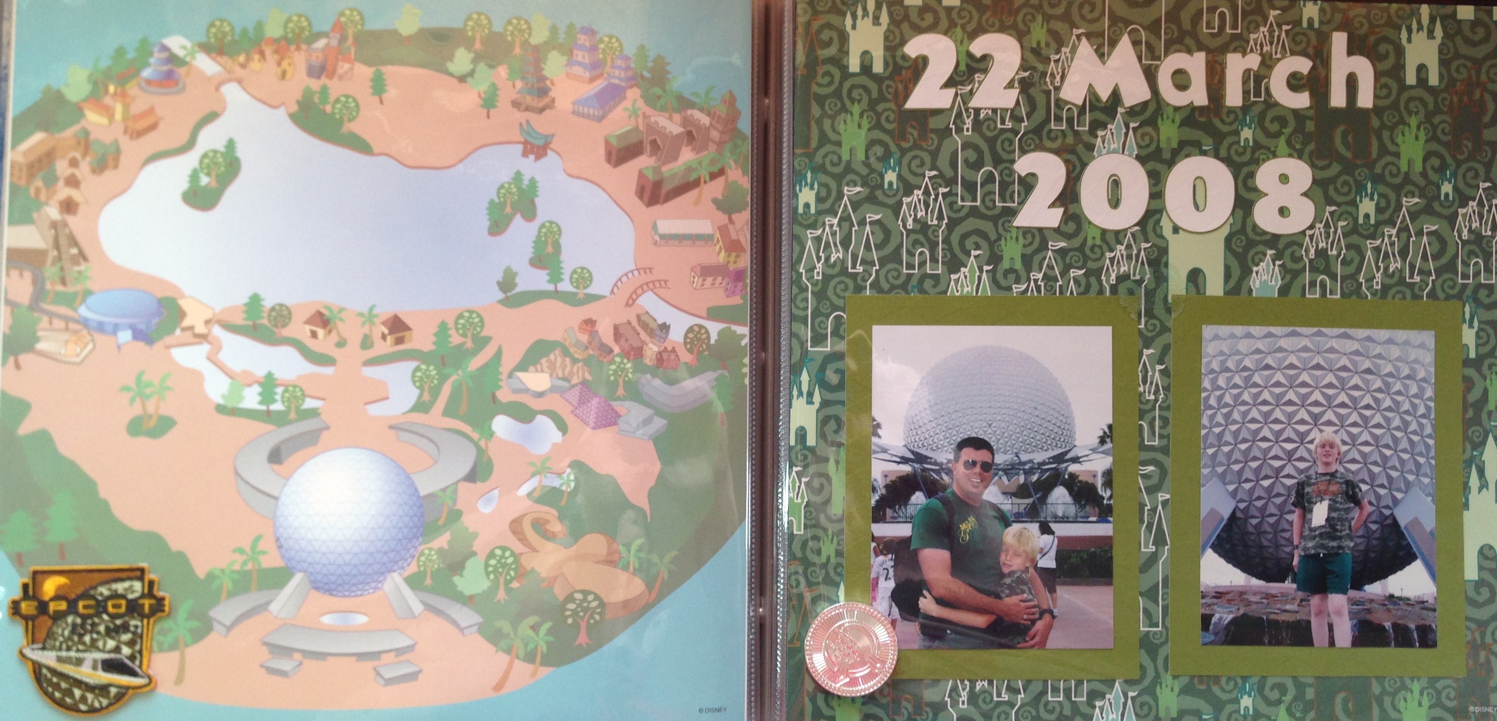 For this spread I used the EPCOT paper, patch and coin that I purchased at the hotel gift store. These pages serve as simple maps that help to remind us of the things that we did at each park. On the right hand side I used entrance pictures in front of Spaceship Earth. If you click on the pages above you will get a closer view of the page. Look closely at the date on this page and you will see that the white letters and numbers have a small green border around them. I accomplished this with my Cricut machine. I first cut the white letters and numbers and then chose the “shadow” feature to cut a slightly larger version. After gluing these together I glued them to the page. While this is a time intensive process I think that it really makes the titling look much more professional.