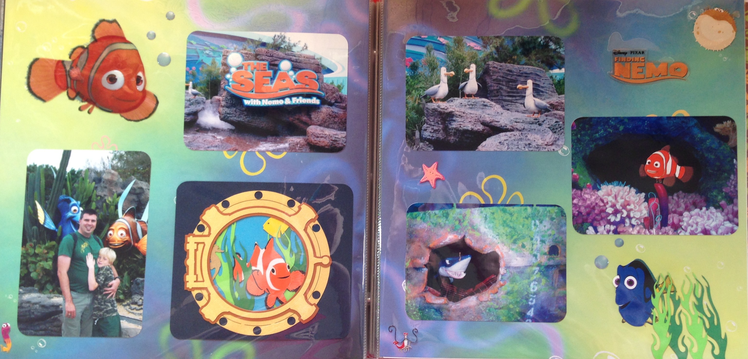 The right hand side picture that has Nemo in it as actually a sticker over a failed picture that I took. One of the aquariums had an animated Nemo swimming in it and talking to us. I tried to take a picture of Nemo – but it just came back black (probably a function of the special effects of the ride), so I stuck a sticker of Nemo over the top of the picture and it turned out perfect.