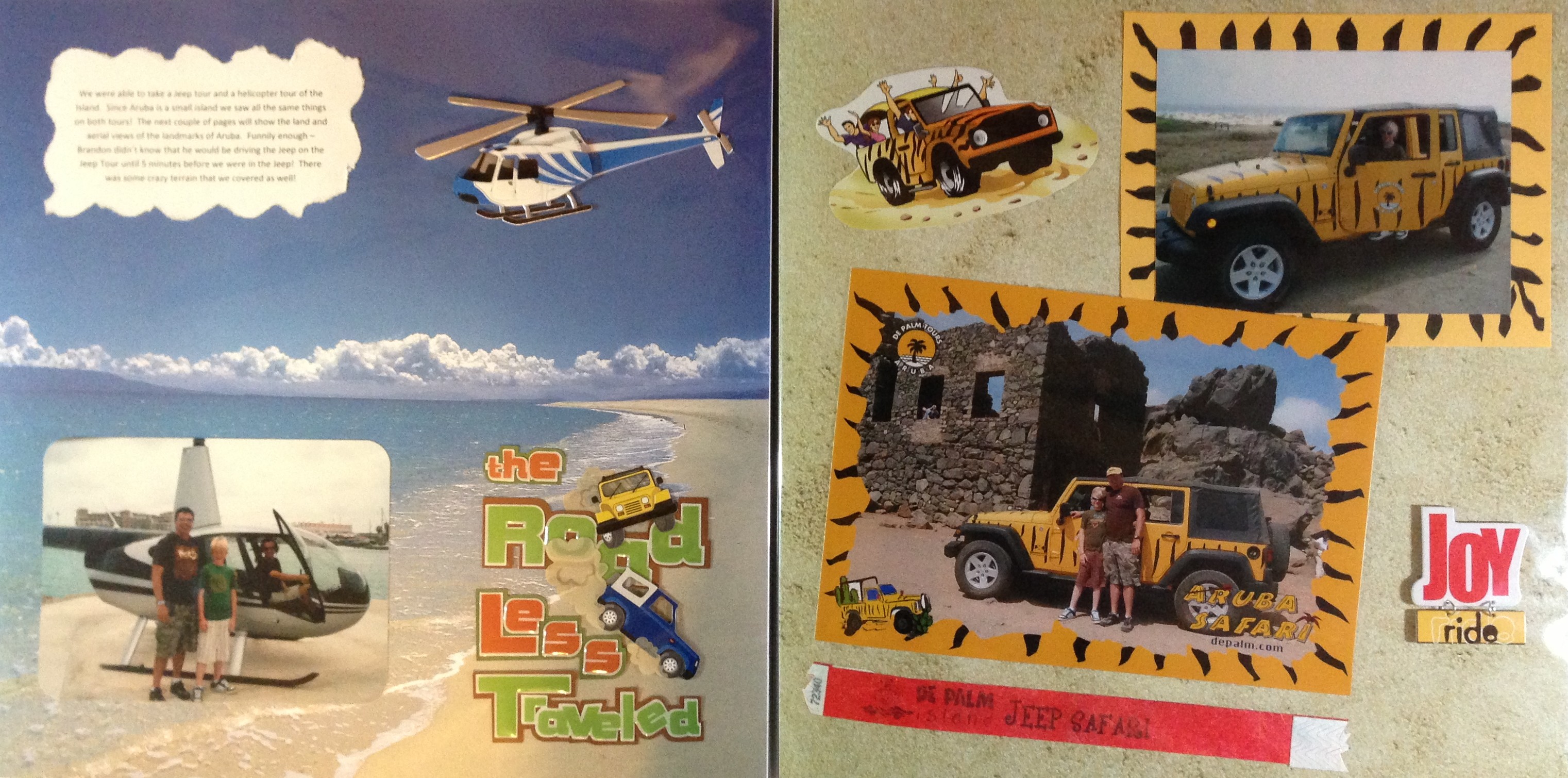 I explained in some earlier posts that this scrapbook was created by theme rather than chronologically. To further highlight this I put these two pages together – our Helicopter Tour and our Jeep Tour – even though they were experienced 4 days a part. In posts still to come you will see how I blended the photos from both experiences together.