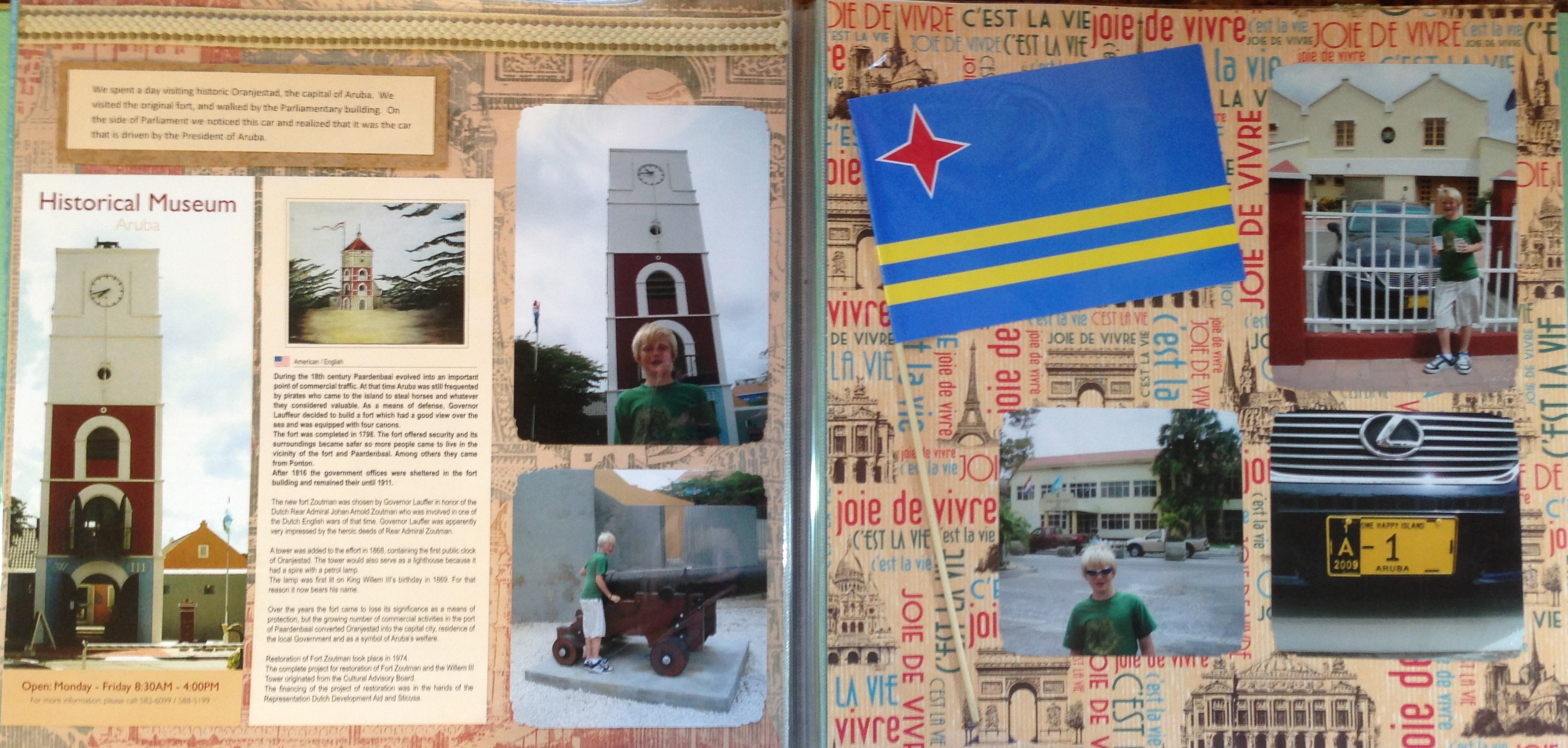 This spread showcases a day that we spent in the Capital of Aruba – Oranjestad. We visited the original fort and walked by the Parliamentary building. As we were walking by the Parliamentary building we noticed a car parked with the license plate “1” so we took a picture of it. It was later confirmed to us that this was the President of Aruba’s car! Not something that you get to see or do in the United States!