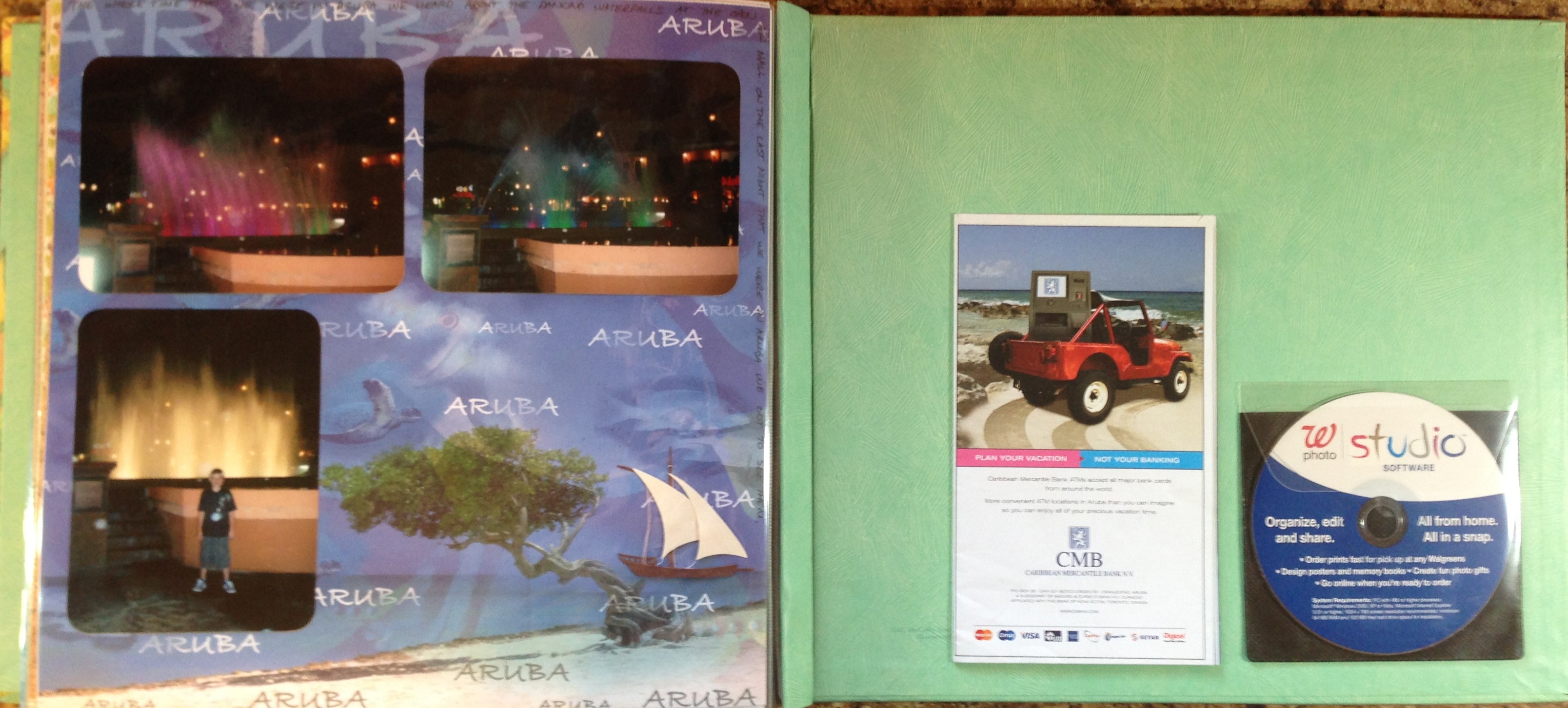 This is the last page in our Aruba album, and the design element that I want to point out is that I mounted a map of Aruba on the back cover as well as a CD of all of the pictures that I took on the trip. I usually do this so that I have a backup of the pictures from my trip with the album, in case something ever happens to my computer where they are stored.