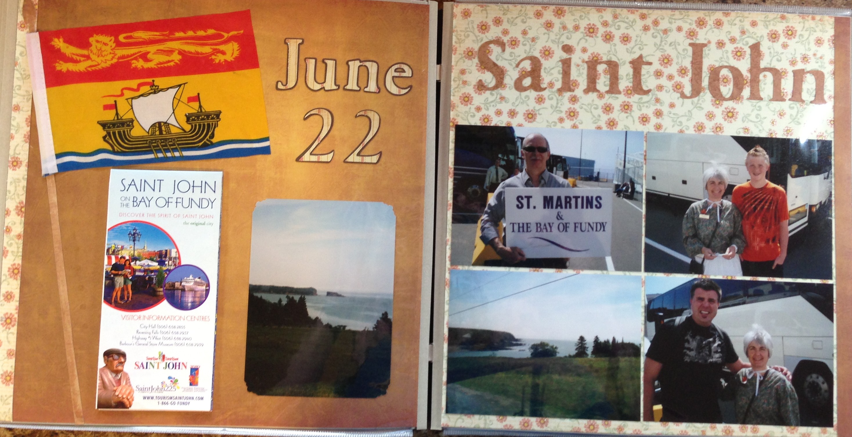 The left hand page includes the Saint John flag as well as a map that can be opened of the Saint John area. I mounted it to the outside of the plastic cover so that viewers could open it. The titling on both pages was cut using my Cricut machine and you will notice on the date that I used the shadow feature to help the date stand out. I also used slivers of each background page to serve as a border accent on the opposite page to help tie the two pages together.