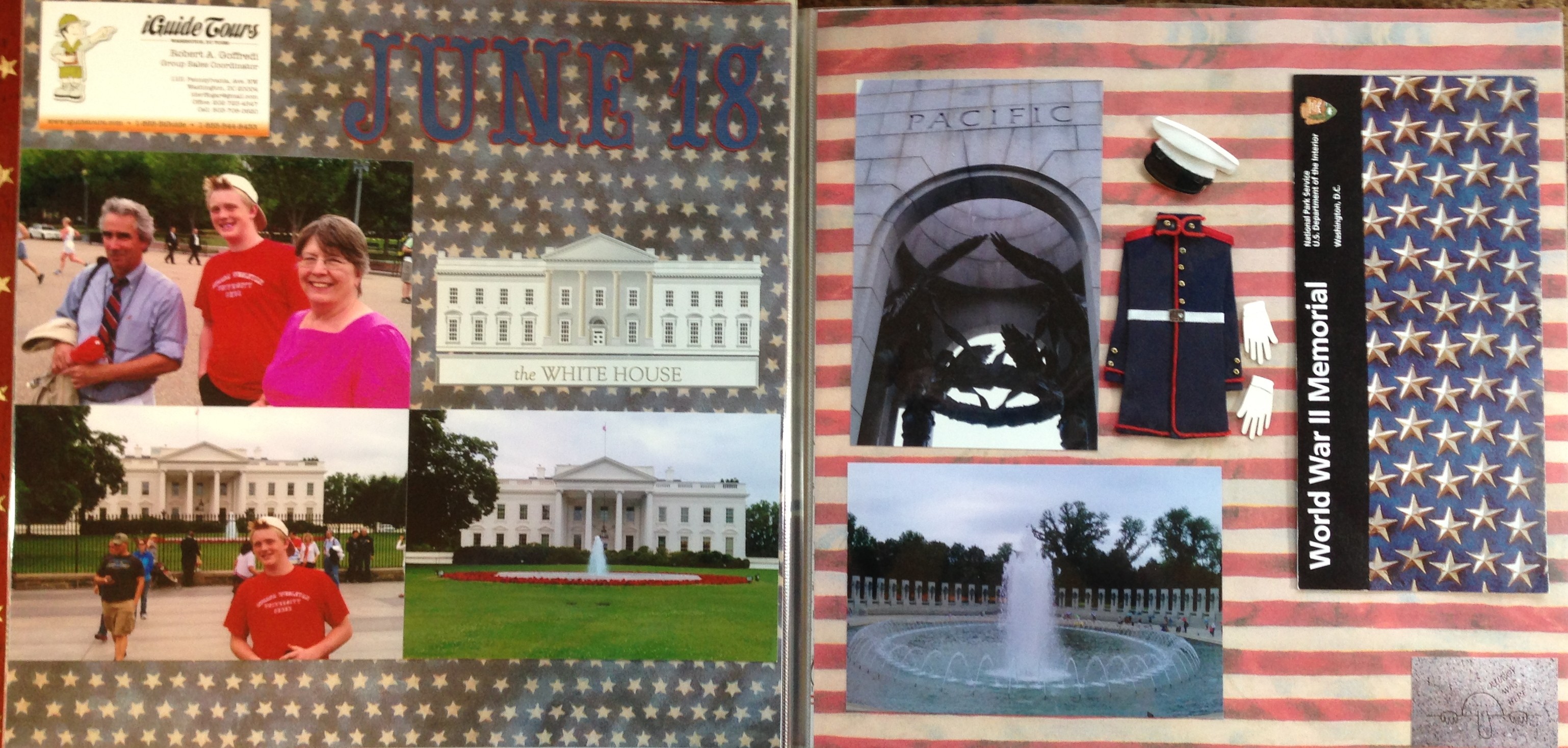 Our tour started with a trip to the White House (we got to see the inside a few days later) and the World War II Memorial. On the left hand page you will see that we loved our guide so much that we had to get him in our pictures. On the right hand page I highlight the World War II memorial. The brochure on the right hand side of the page is affixed to the plastic page protector so that readers can open it to discover more about the memorial. If you look carefully in the bottom right hand corner you will see a small photograph (sorry that it is hard to make out in this picture), that says “Kilroy was here“. Our guide showed this to us on the memorial – and mentioned that not many people know that it is part of the memorial.