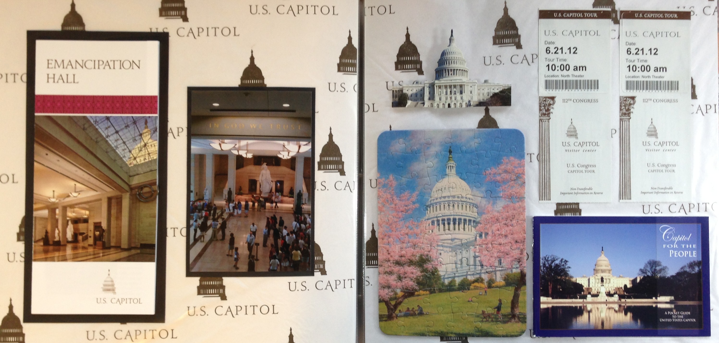 The third page was a lot of fun for me. The background to these pages is actually tissue paper from the gift shop! I didn’t need any for the items I purchased but I saw it behind the counter and asked if I could have two sheets of it for scrap booking and they gave it to me with a smile. Moving from left to right, the first item is a map of Emancipation Hall, which is the new visitors entrance to the Capitol building. The is mounted to the outside of the plastic protector so that the reader can open it to view it. I put a black background border under the plastic protector to help the brochure stand out against the white background. Next is a photograph that I took of the Hall including the words “In God We Trust“. Next is a puzzle that I purchased and put together to put on the page. I used Modge Podge to help it stay together. I am not sure if I would do this again as the puzzle is pretty thick and makes the page a little awkward to turn. On the far right are our tour tickets and badges and underneath them is a small tourist book that is mounted to the outside of the plastic protector.