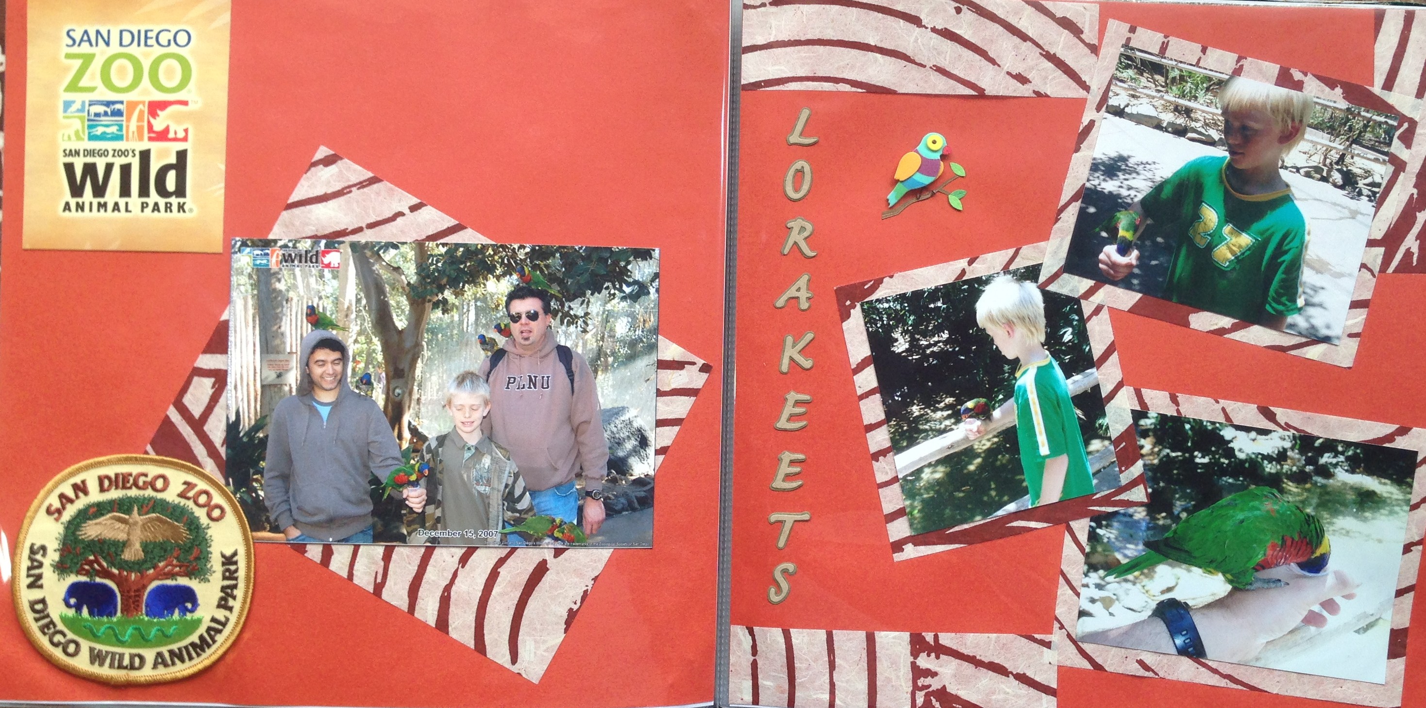 Something that you must do on a visit to the Wild Animal Park is feed the Lorakeets. On the right hand side of the page I used an animal print paper for the borders of the pictures and some accents on the page. On the left hand side I placed a professional picture from our experience and cut out the Zoo logo from the cardboard sleeve that it came in. I also used a patch that I purchased at the Wild Animal Park gift store.