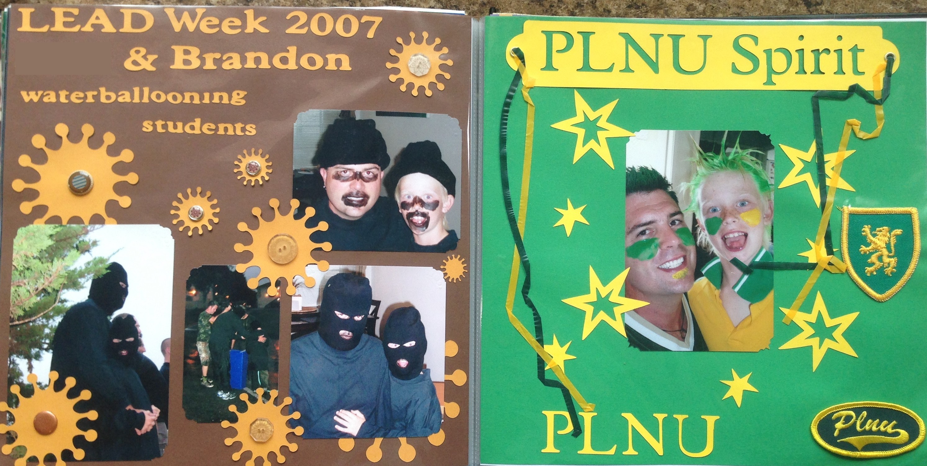 The right hand page shows how we “painted up” for a spirit event that the students were holding. Again, the stars and the titles were cut using my Cricut machine. Notice that the PLNU at the bottom is from the title silhouette banner at the top of the page. I also affixed two patches from PLNU on this page and included the stray strands from pompoms that my son picked up at the event.