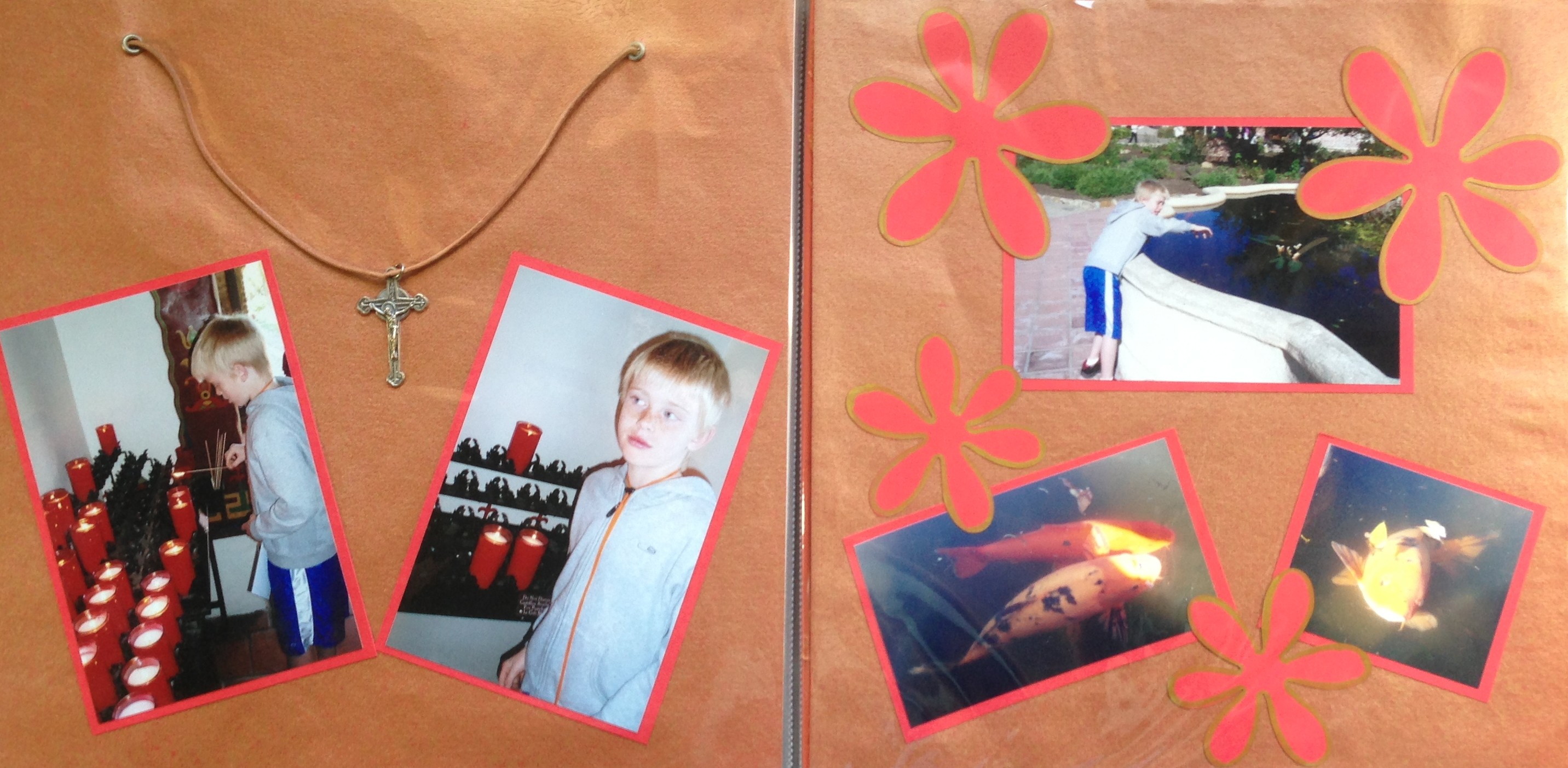 For this last spread I created the color scheme around the color of the Koi and the candles. Notice that the background paper shimmers like the scales of the fish, and all of the borders to the pictures are red. I used my Crop-A-Dile Big Bite Punch to put holes and grommets in the left hand page so that I could add the crucifix necklace that we purchased at the Museum store. I used my Cricut machine to cut the flowers on the right hand page. I then used a gold marker to trace around the edges of the flowers to help add depth to them.