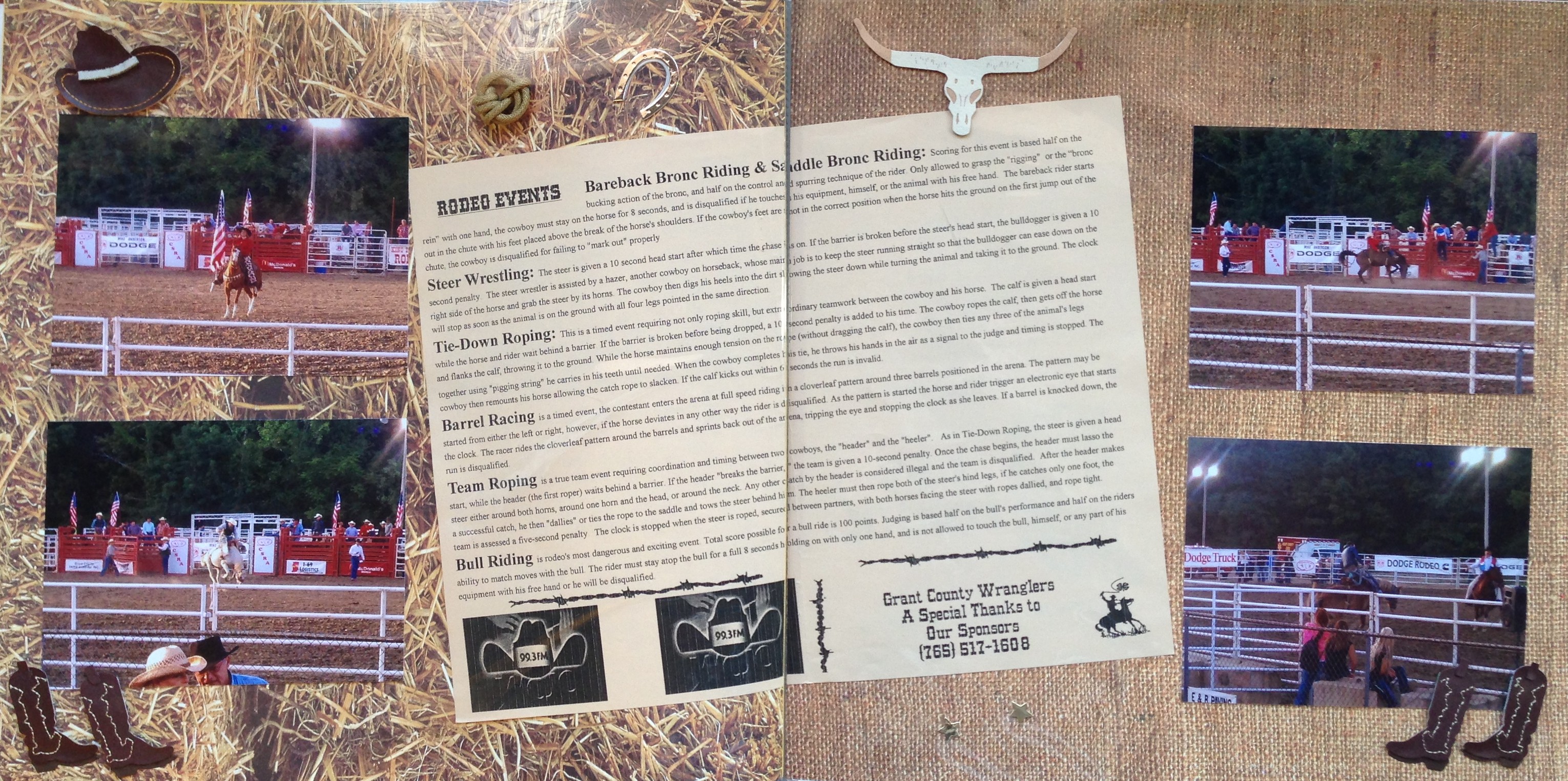 For this page I used background papers that are photographs of burlap and straw to work with the country western theme. Jolees has some wonderful country and cowboy sticker packs that I used on this spread as well. Most of the program was advertising so I didn’t want to put the whole thing on the page – but the section that explained what the different events were I thought was important to include. I couldn’t fit it on one page in a way that was attractive, so I cut it down the middle at an angle and pasted it over two pages. I originally had these pages in a post bound book – and it looked good. I later needed to move the pages to a three ring binder album, and it doesn’t look as good in that due to the one inch of space between the pages that is created in a three ring binder.