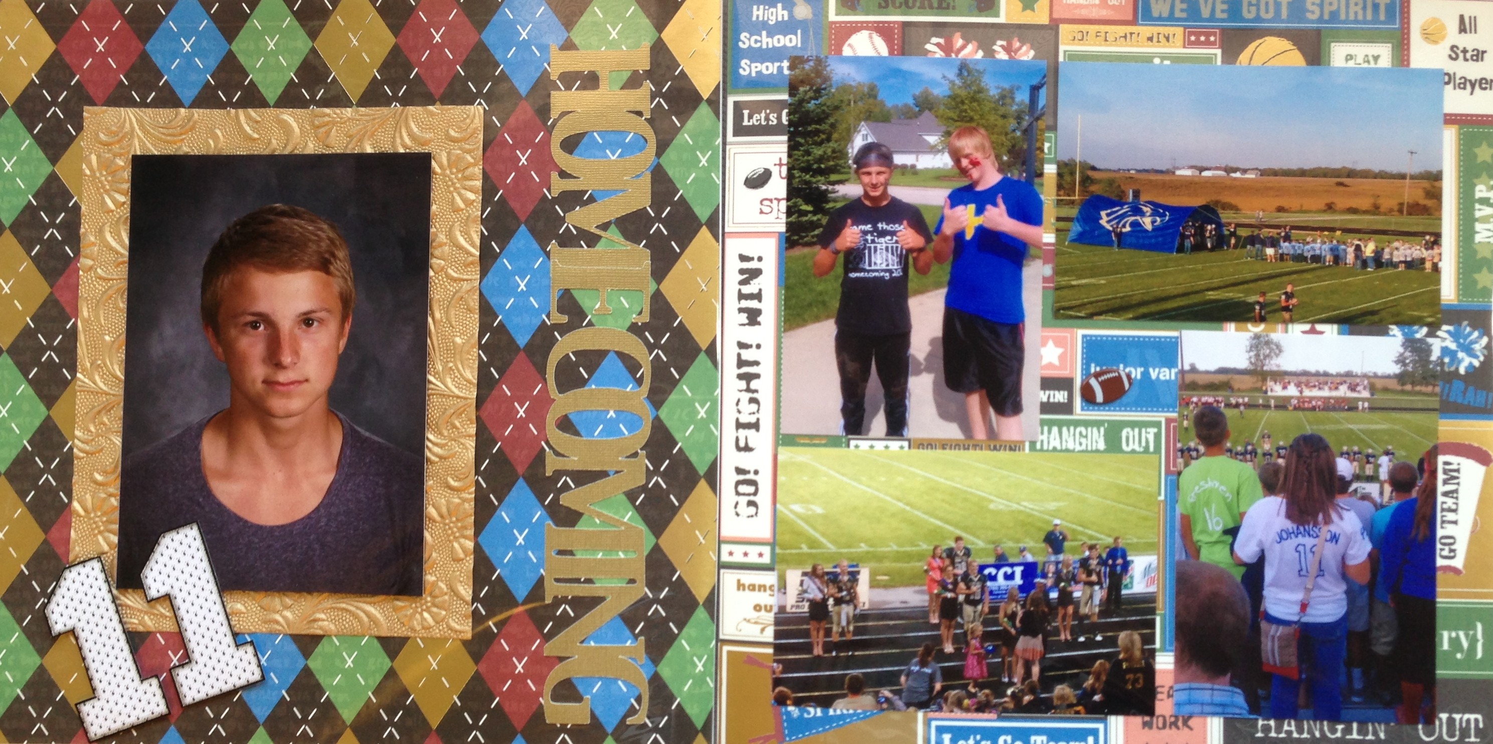 This spread highlights the Homecoming football game and Jonathan’s official school picture. For the “Homecoming” title I used my Gypsy to kern the letters to blend together so that I could cut it out in one cut with my Cricut machine.