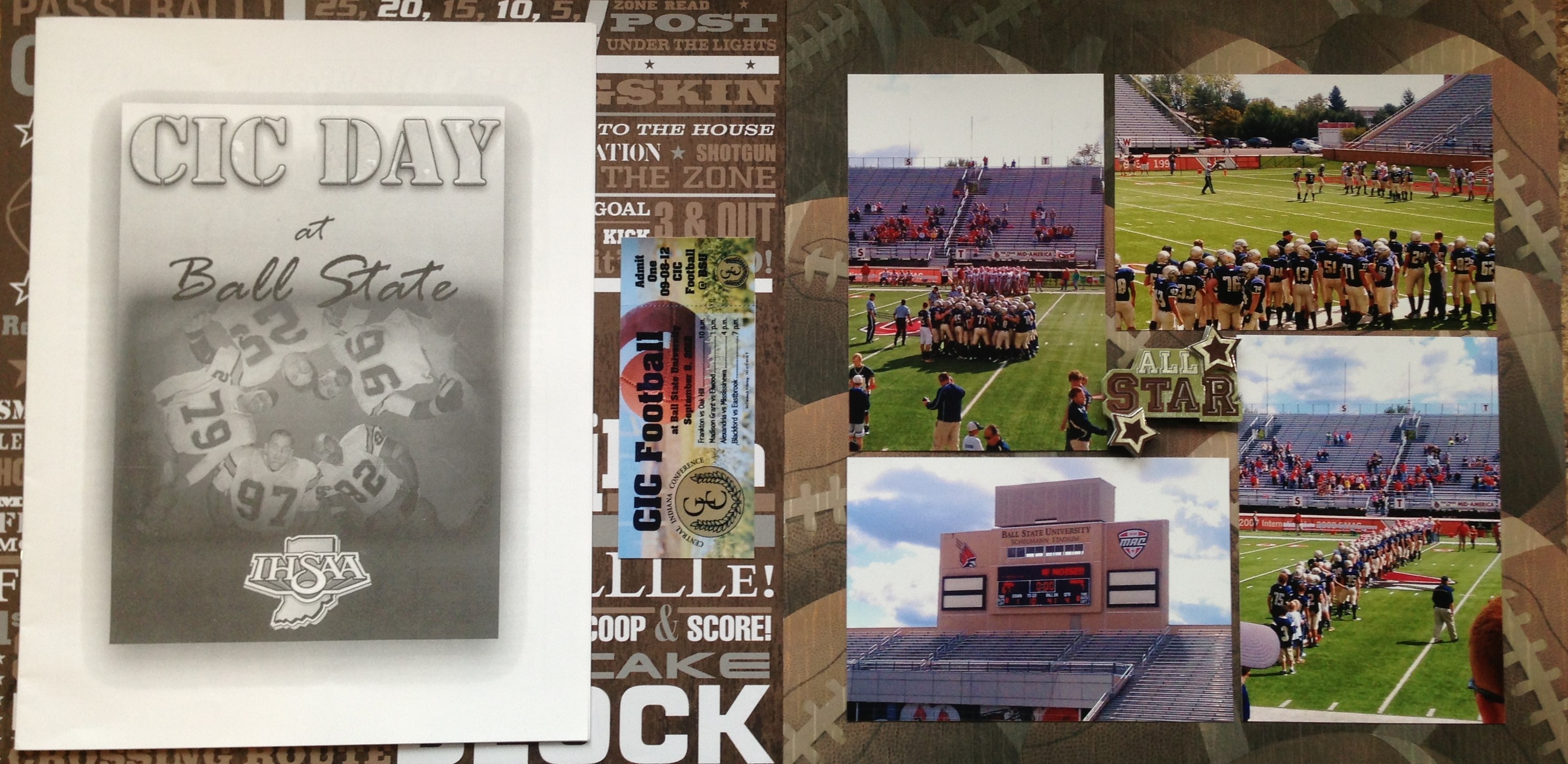 This spread highlights a special game for the conference that was held at the stadium of a nearby College. The team was very excited to play in a “real” stadium. On the left hand page is the program for the day which I attached to the outside of the plastic protector so that the viewer could read it. Next to the program is a photograph of the ticker that I had to purchase to go to the game. They would not let me keep the ticket so I took this picture quickly before I turned my ticket in. On the right hand side are pictures from the day. Notice the placement pattern that I used that created a space in the middle of the pictures.
