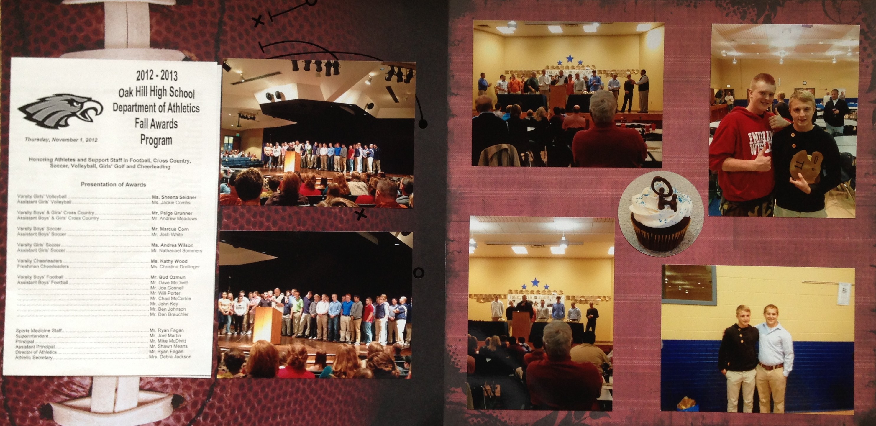 This spread commemorates the Athletic Awards Night and the Football Banquet and Awards Ceremony. These were two different events that I combined into one spread. The left hand side is the Athletic Awards night. I affixed the program to the outside of the plastic protector so that the viewer could look at it. The right hand side is from the Football Awards banquet. Notice the placement of the photographs on the right hand side to make room for the round picture of the cupcake in the middle.