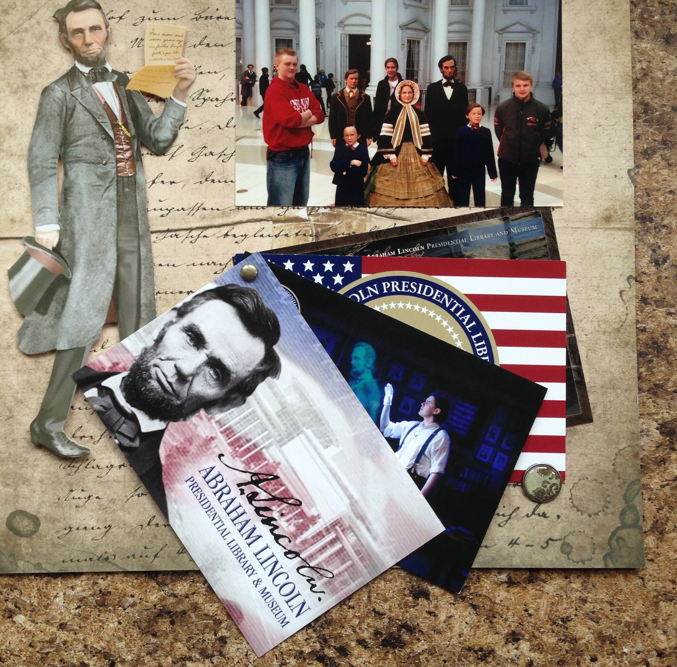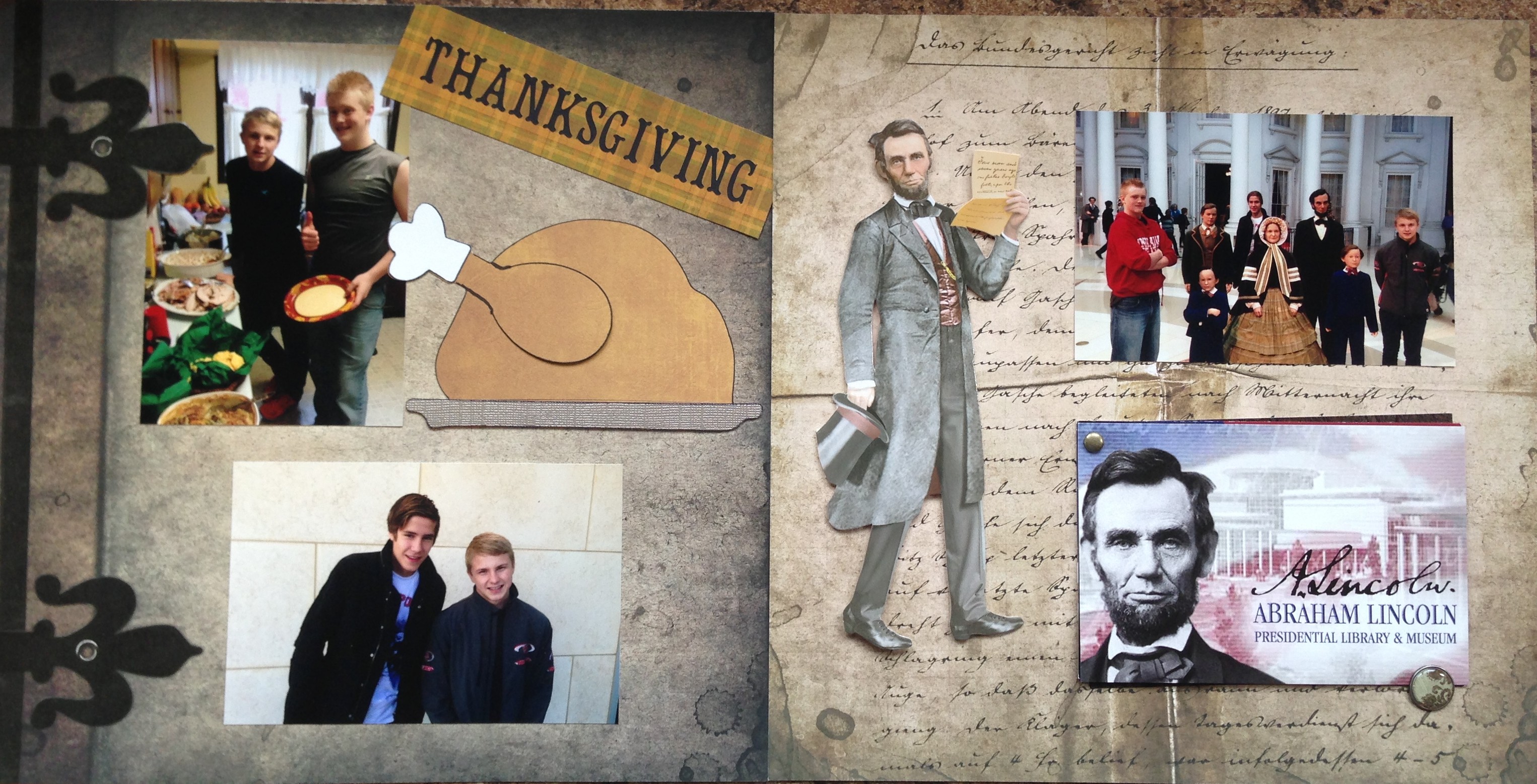 This spread highlights these two events – our Thanksgiving meal together and our time at the museum. Unfortunately I didn’t think about taking too many pictures at Thanksgiving Dinner, but I wanted Jonathan to remember this American Tradition in the Scrapbook. I also didn’t get too many pictures at the museum because we were not allowed to take them in the exhibits. you will notice though that we were fortunate enough to be there when the Lincoln family was present and we got a great picture with them.