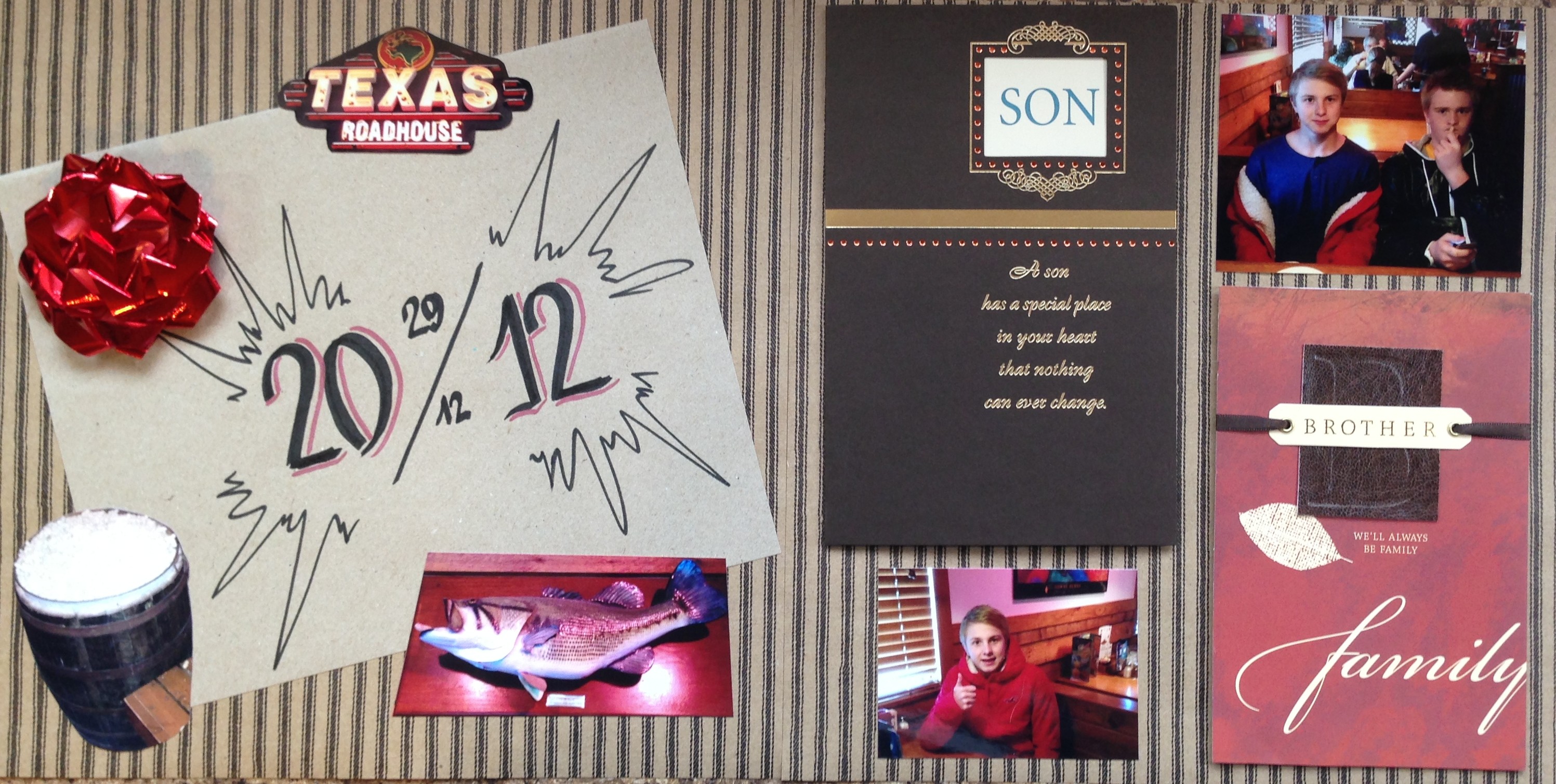 I used a country material pattern for the background paper on both pages as it matched the ambiance of Texas Roadhouse. On the left hand page is the envelope from the card that our exchange student’s parents sent him, as well as photographs from the restaurant. I cut all of these out by hand with a pair of fine point scissors.
