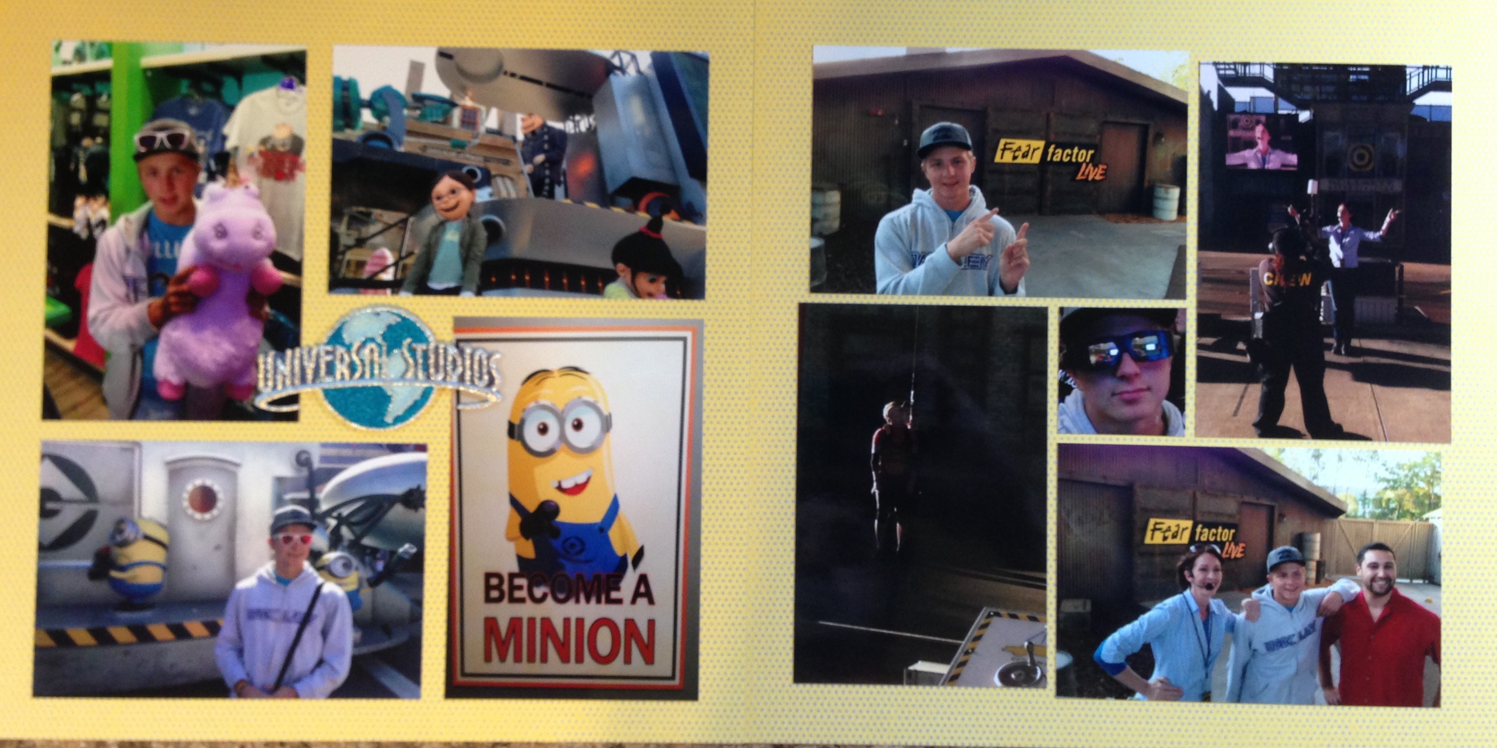 Our exchange student was mesmerized by “Despicable Me” and loved the Minions and the “Its so fluffy” unicorn, so I knew that I needed to dedicate at least one page to the Minions. I chose the yellow background page color to pay homage to the minions, but it also worked well with the “Fear Factor” theme colors. By the way, we stood in line for three hours to ride the new “Despicable Me” ride and it was not worth the wait. It wasn’t that great of a ride.