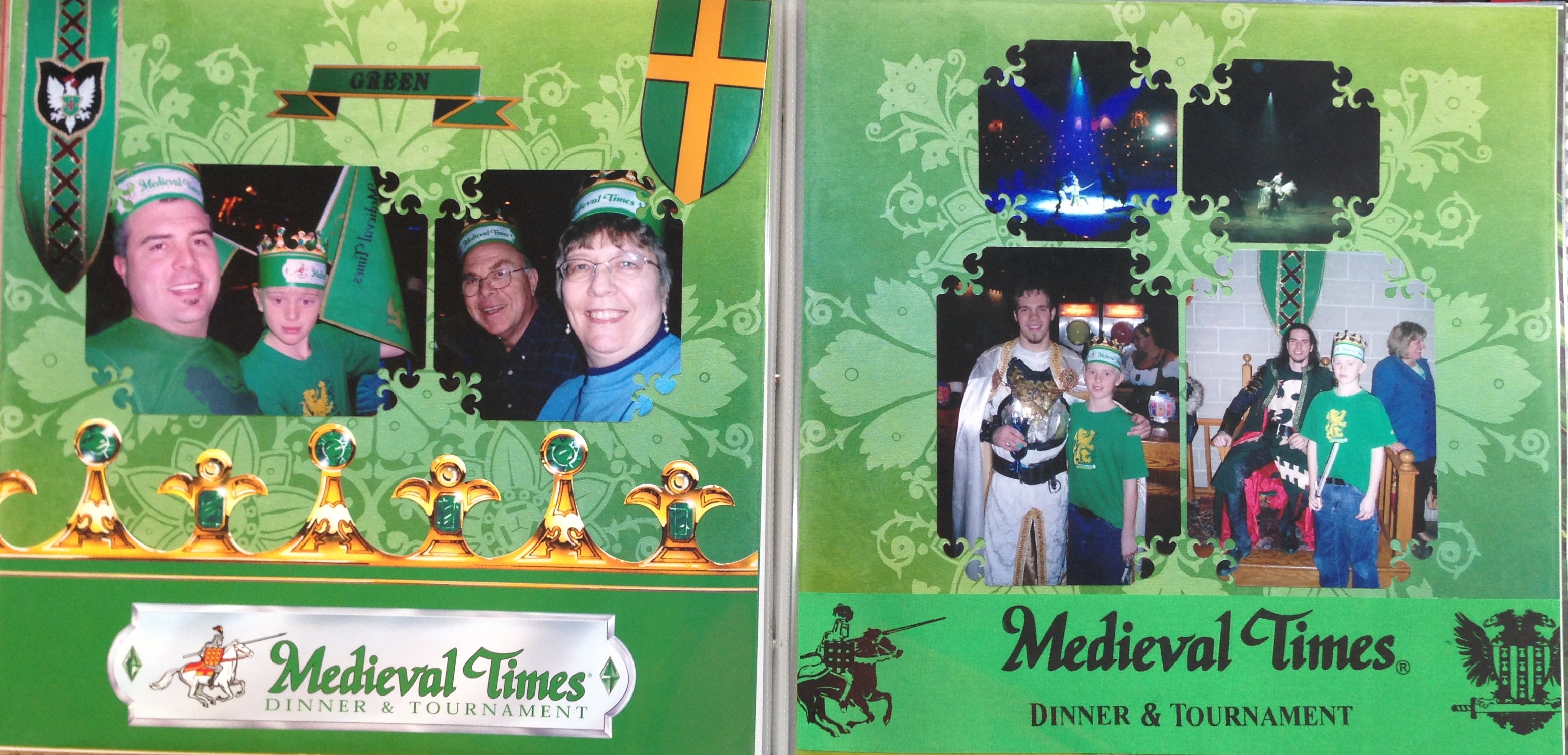 This is the second spread commemorating our visit to Medieval Times (View spread 1). If you have ever been to Medieval Times you will know that every guest sits in a section which cheers on the individual knights. We wore our green shirts because we wanted to be in the Green Knight’s section. The green knight is usually the bad character in the plot – but green is our favorite color so there you go!