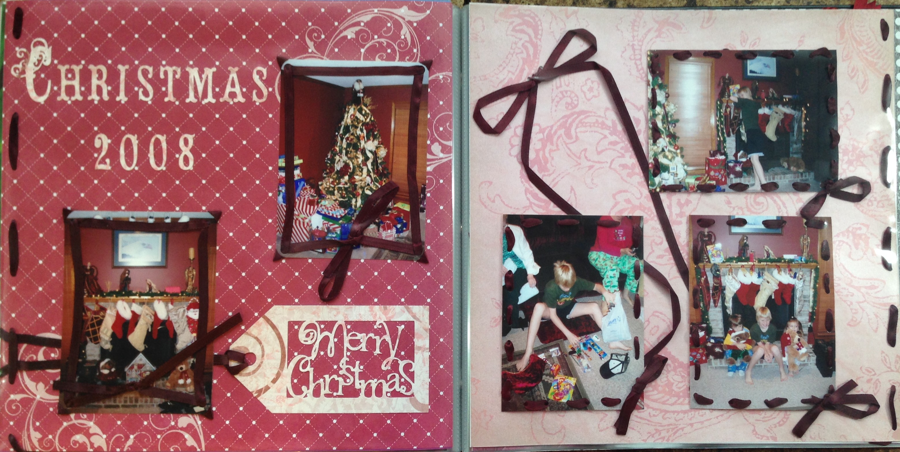 2008 was the first year that we owned a home and could host the extended family for Christmas so we were very excited. Several of the gifts at this Christmas were wrapped in the burgundy ribbon that you see on this page. I wanted to incorporate the ribbon into the page so I tried several new techniques for me.