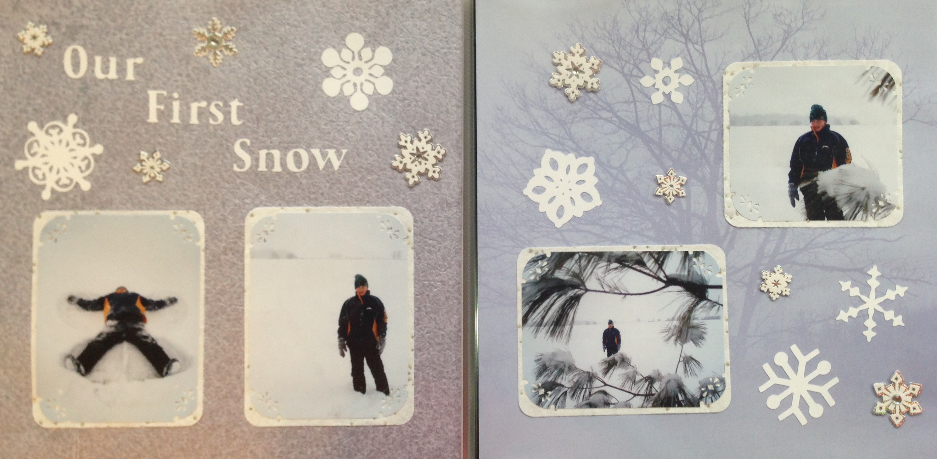 I used white and grey color themes on this page to enhance the feelings of the white/grey from that day. I used a natural paper which was very thick to border my photographs. If you look carefully at the corners of the photographs you can see that I used a corner punch to round the edges and stamp a snow patter into the corners of them as well.