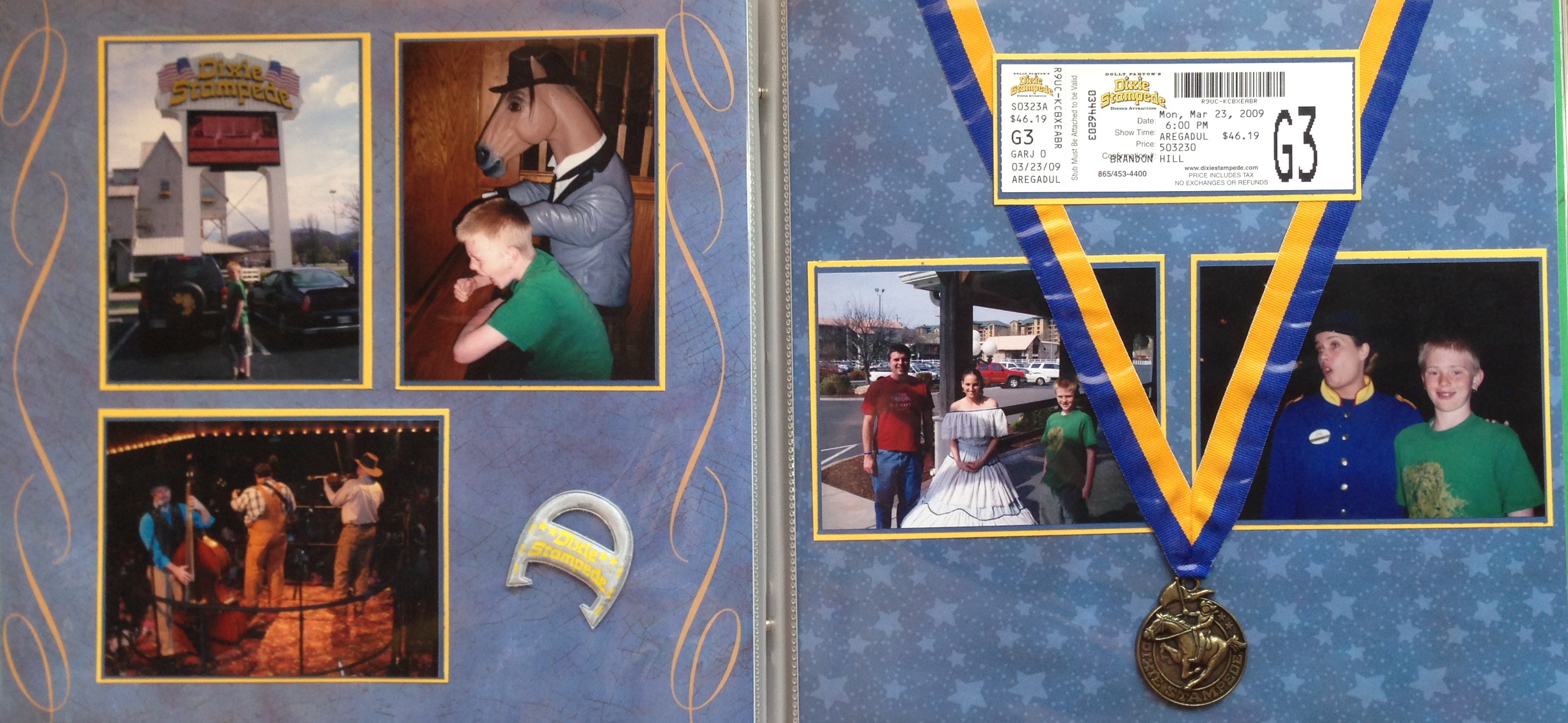 The color scheme for this page comes from the medallion which we received at the event and the ribbon which was blue and yellow. I chose blue background paper to compliment this, and bordered all of the photographs with blue and yellow borders. I did the same with a ticket stub from the event. I like to put ticket stubs on my pages at it serves as a great reminder of date, time and place of the event. in this case it shows the price as well :). So – if you plan to go to the Dixie Stampede – this will help you plan your budget!