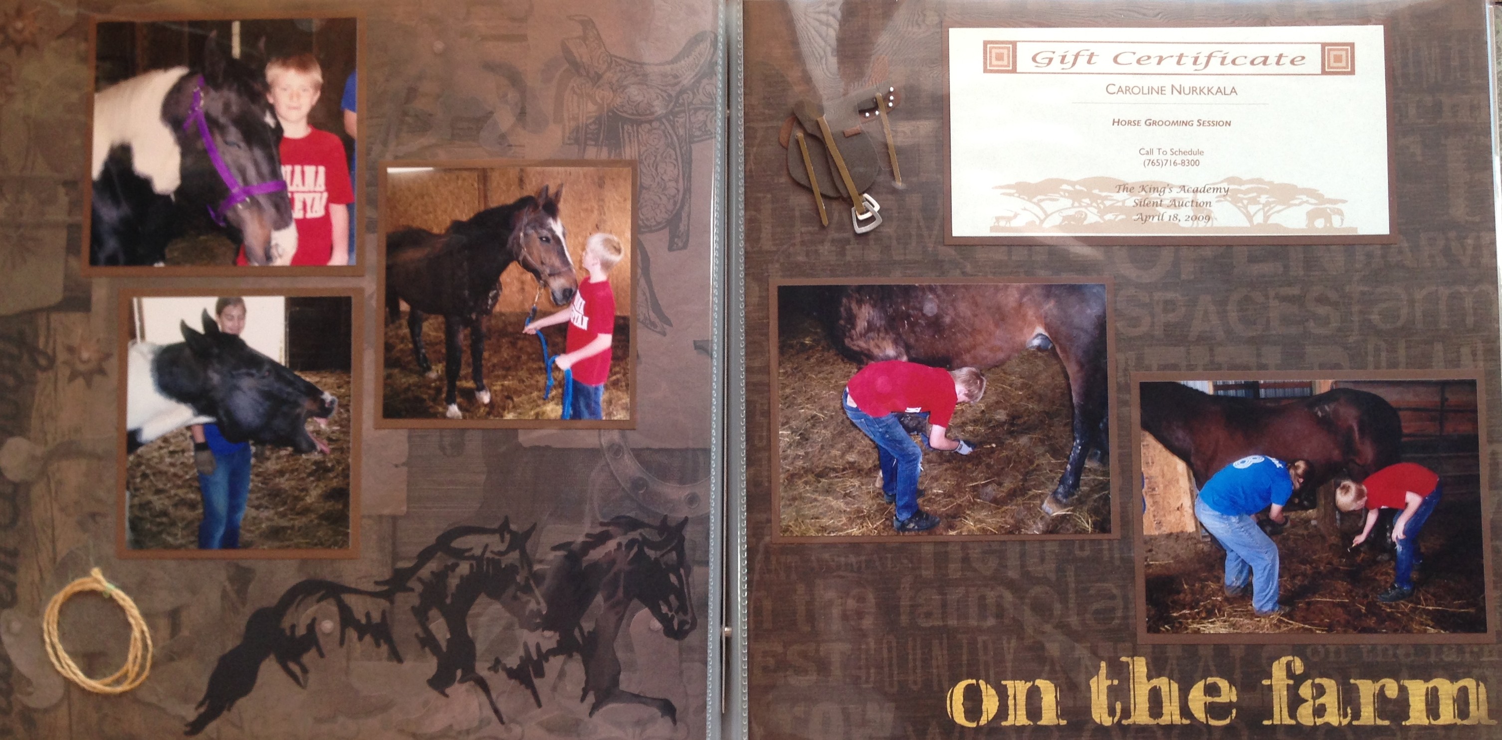 For this page I chose a color scheme that mimicked the color of the horse – brown. I was fortunate enough to find background papers at my local scrapbook store that horse and farm themes. The two horses on the left hand page are actually a laser cut that I also found at our local scrapbook store.