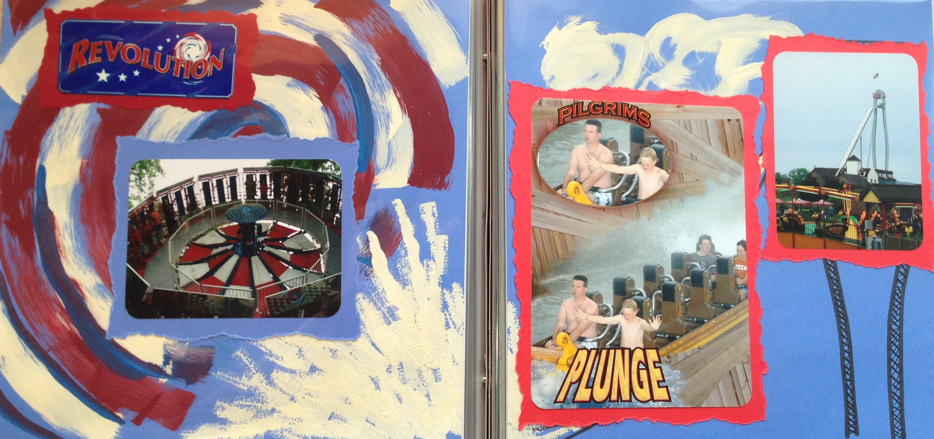 This spread showcases two rides at Holiday World – the Revolution and Pilgrim’s plunge. Revolution is in the Fourth of July area of Holiday World and is a ride that spins around and presses its riders up against the walls. I cannot ride this ride because I get very motion sick, but my son rode.