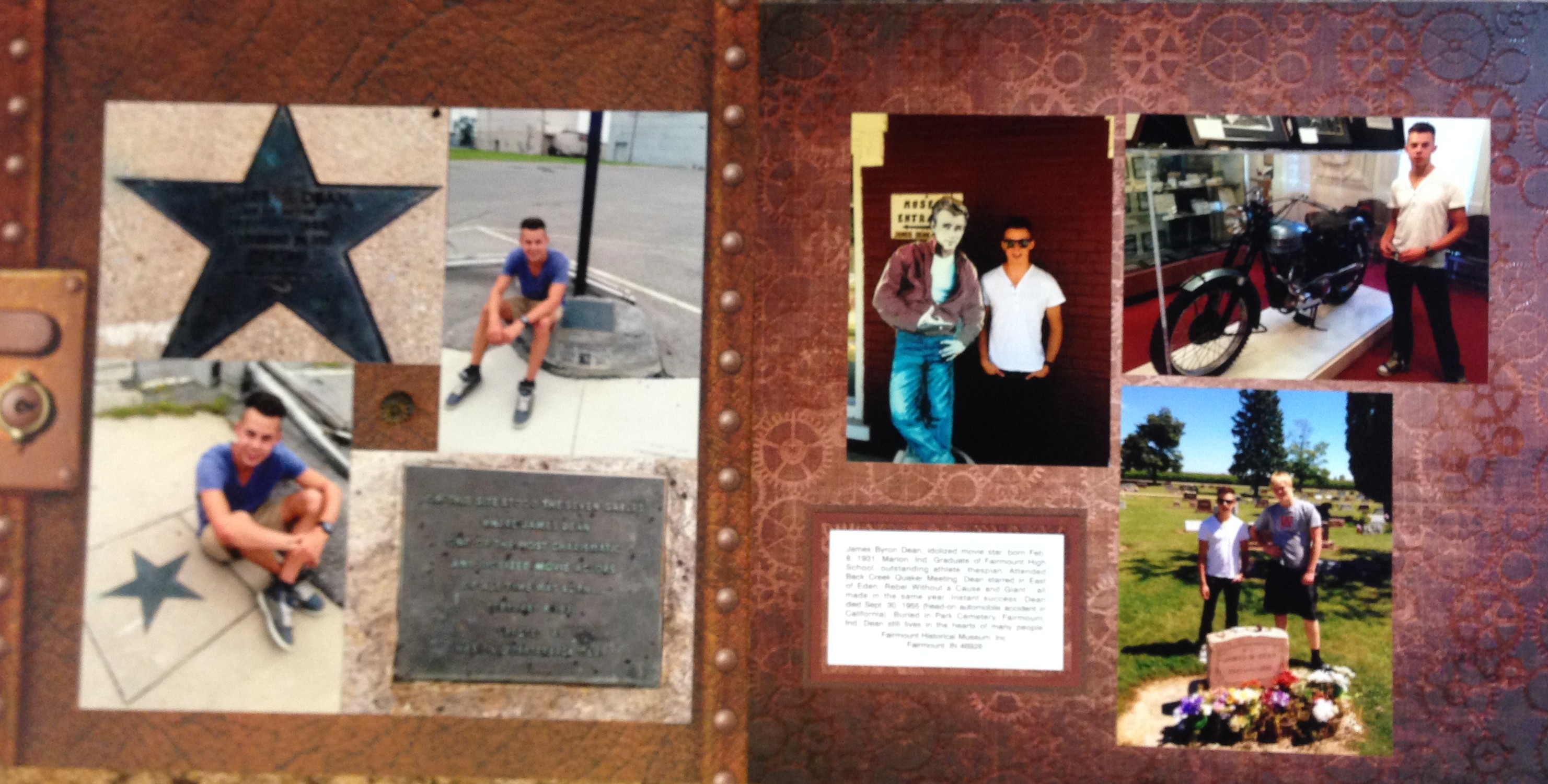 On the left hand page are pictures of Luca at James Dean’s Birthplace. It is now a parking lot as the building was in very bad shape. Here is what Wikipedia says about James Dean’s birthplace and early life:
