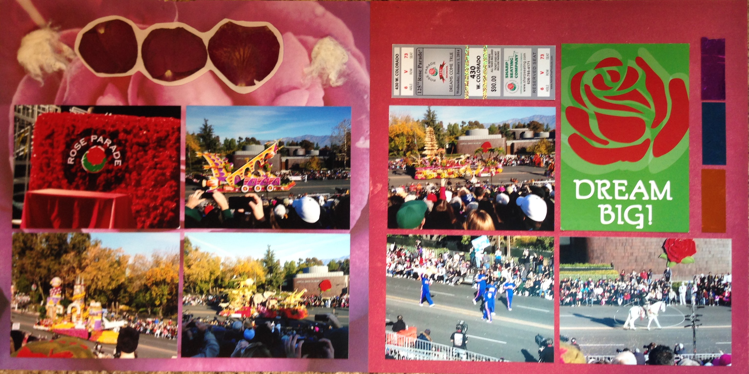 My parents, who did not go to the parade with us, instead went to see the City of Downey Float, that we had helped to decorate earlier in the week (See scrapbook page of that experience), and my mother was able to collect some rose petals from the float and pressed them and sent them to me for the scrapbooks. They are mounted on the top of the left-hand page. I was intending to use my Zyron Sticker Maker to laminate the petals to help preserve them, but I accidentally sent them through the machine with the sticker maker tape in instead of the laminating tape. The rose petals were not strong enough for the sticker paper to come off without damaging them, so I had to mount them to the page with the white backing on. While this was not ideal, the white backing does help for the petals to stand off of the page. If I had realized this earlier, I would have used a straight cut line to cut around the petals so that it looked cleaner.
