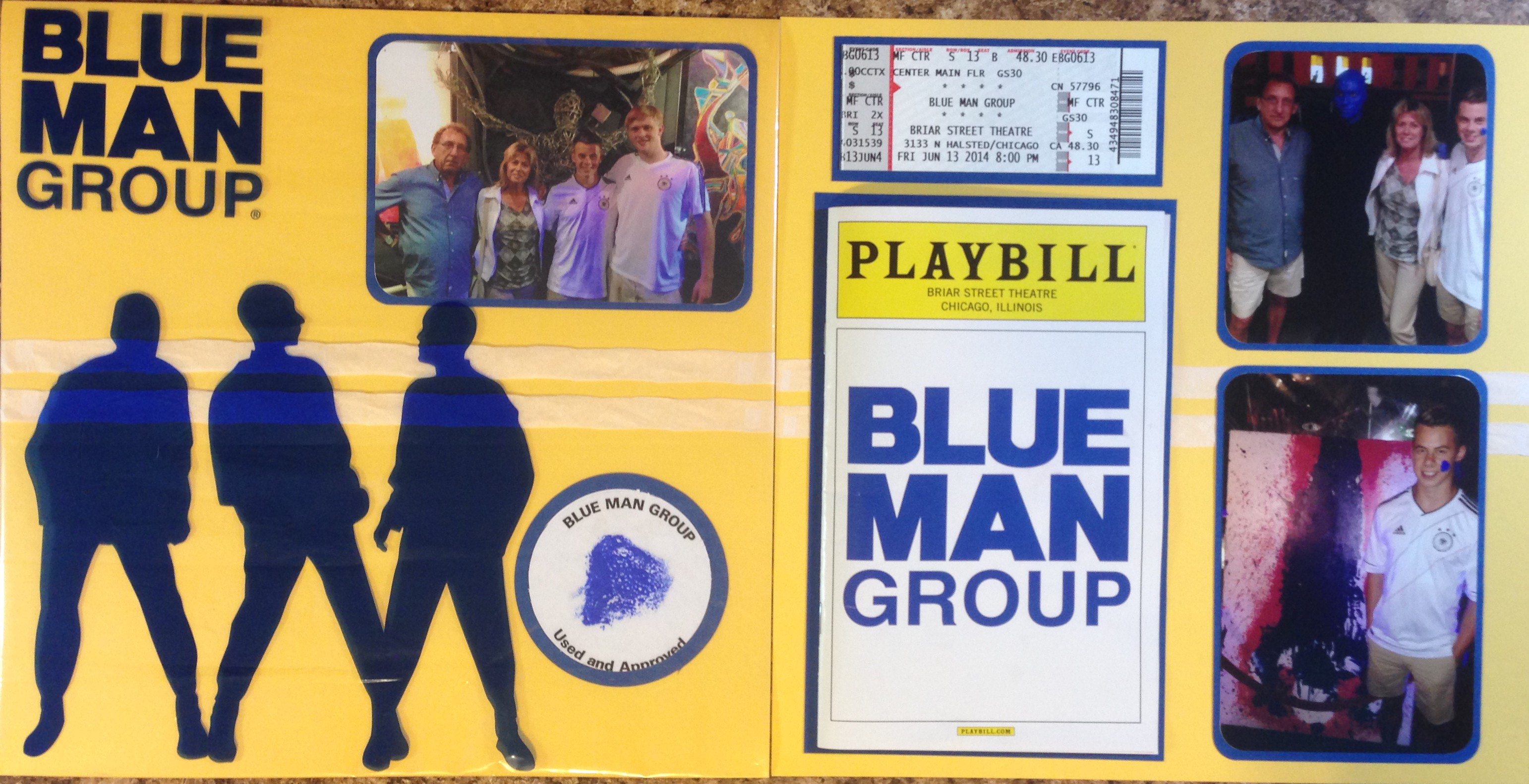 You know by now that I love ephemera and this page contains several pieces. The white strips across both pages are pieces of string confetti used during the show, and the left hand page is covered with the plastic bag from the gift shop (the 3 blue men and the words “Blue Man Group”). The pictures and the blue thumb print are behind the plastic bag. The blue thumb print was lifted carefully from Luca’s face after the show and then turned into a sticker using my Xyron Sticker Maker in order to protect the oil based blue paint that takes years to dry!