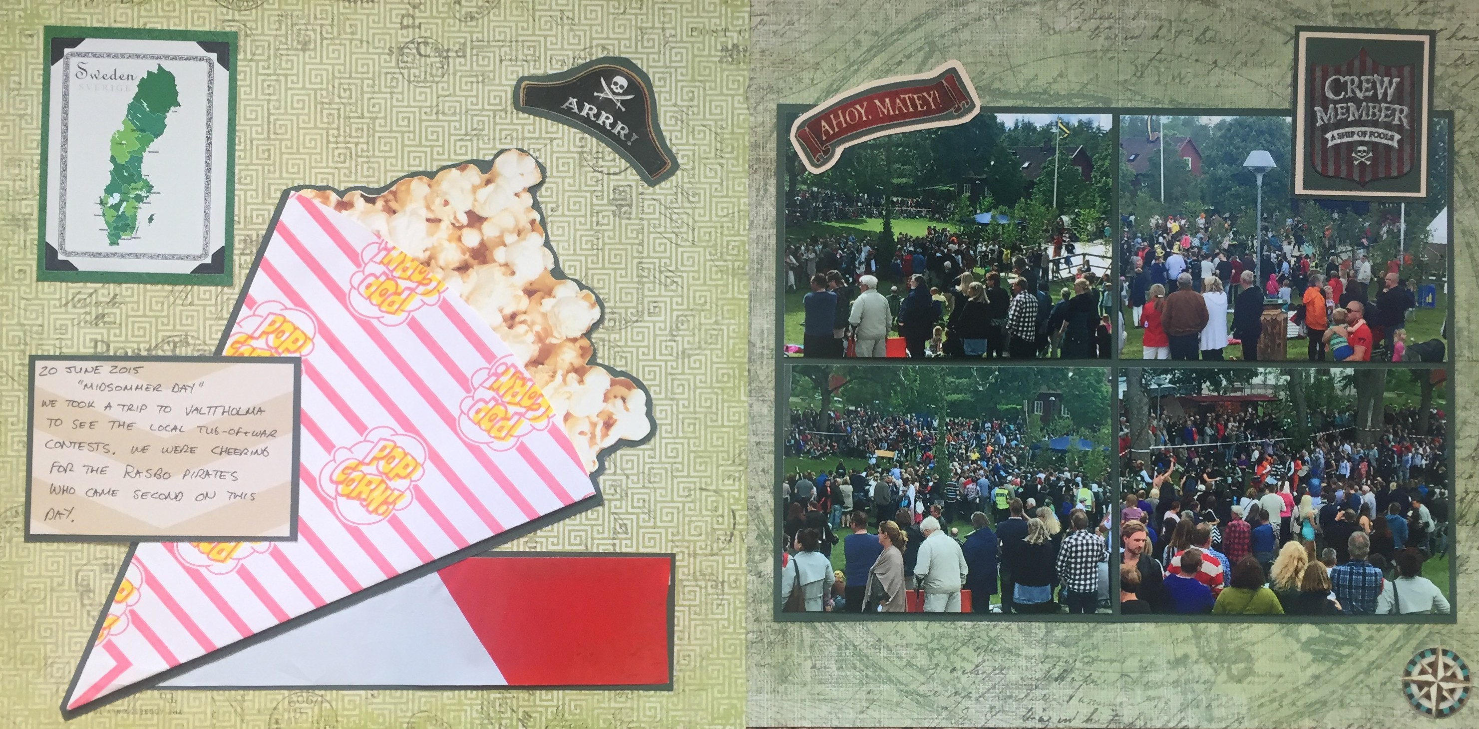 I chose a green theme for this page due to all of the greenery in the photos that I wanted to use. I bordered the pictures in green, and used a tan accent color to border some of the stickers to help them stand out. On the left hand page you can see some of the caution tape that was used to cordon off the tug of war area, as well as a unique cone shaped popcorn container that we enjoyed at the event. I had some popcorn photograph paper which I used to “fill” the cone with popcorn. Both of these items were bordered in green as well.
