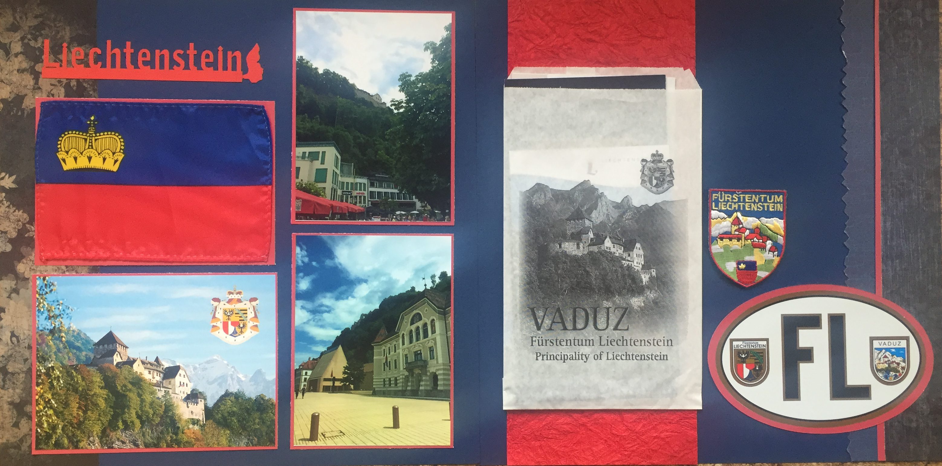The color theme for this page is based on the Liechtenstein flag which is red and blue. I chose a blue background paper and then used red for highlights and to border the pictures. In addition to the flag that is on the left hand page I have two photos that I took as well as a postcard of the palace which I was not able to get a great picture of. The right hand page has a car decal (FL, does not mean Florida, it means Fürstentum Liechtenstein, which means Principality of Liechtenstein), a patch, and an envelope of informational brochures that I picked up at the tourism office in town.