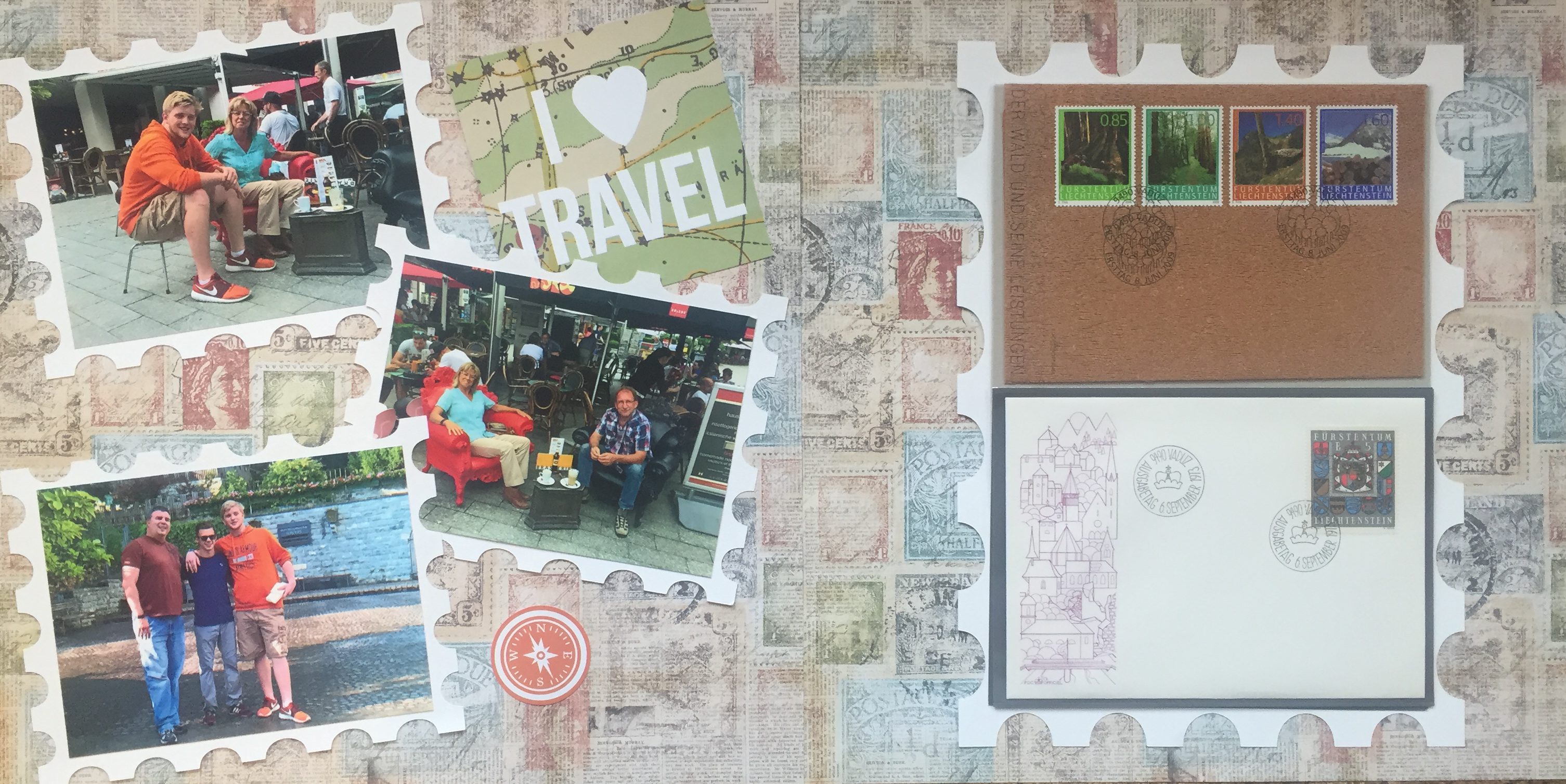 The left hand page has pictures of us with our friends, the Reichmanns, at a couple of places in Vaduz. I used my Cricut machine to cut the white stamp edge borders for the photographs to continue the stamp theme, and of course, I had to use stamp background paper.