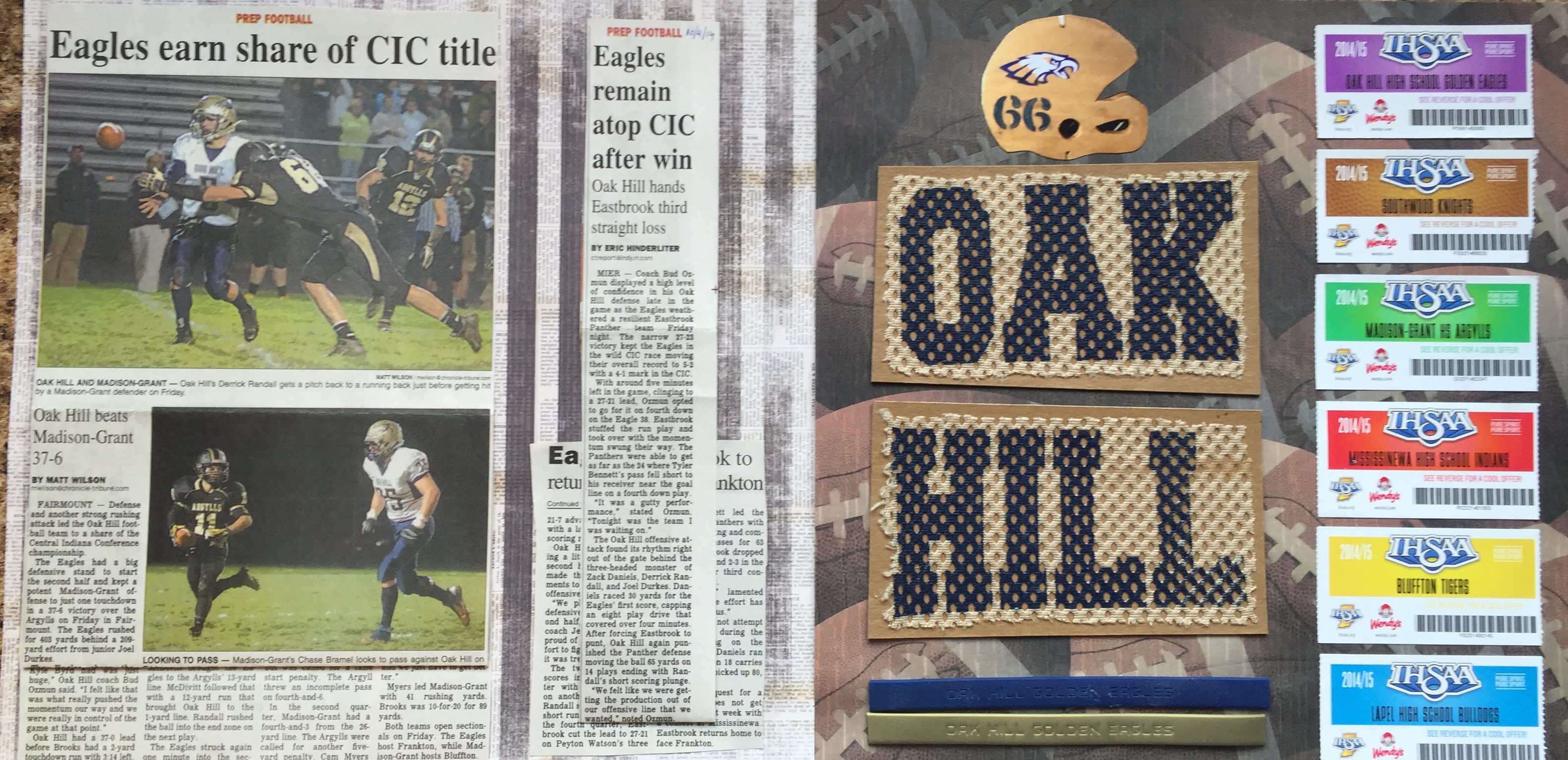 This spread showcases newspaper articles, tickets, and other ephemera from the the football season. The helmet at the top of the right hand page is a picture that I took of his number on the fence and cut to shape. The “Oak Hill” was actually cut from his practice jersey which was a mess at the end of the season and I used modge podge to affix it to cardboard with I then cut and put on this page. At the bottom of the page are two rubber Oak Hill Pride bracelets that we wore all season in support of the team.