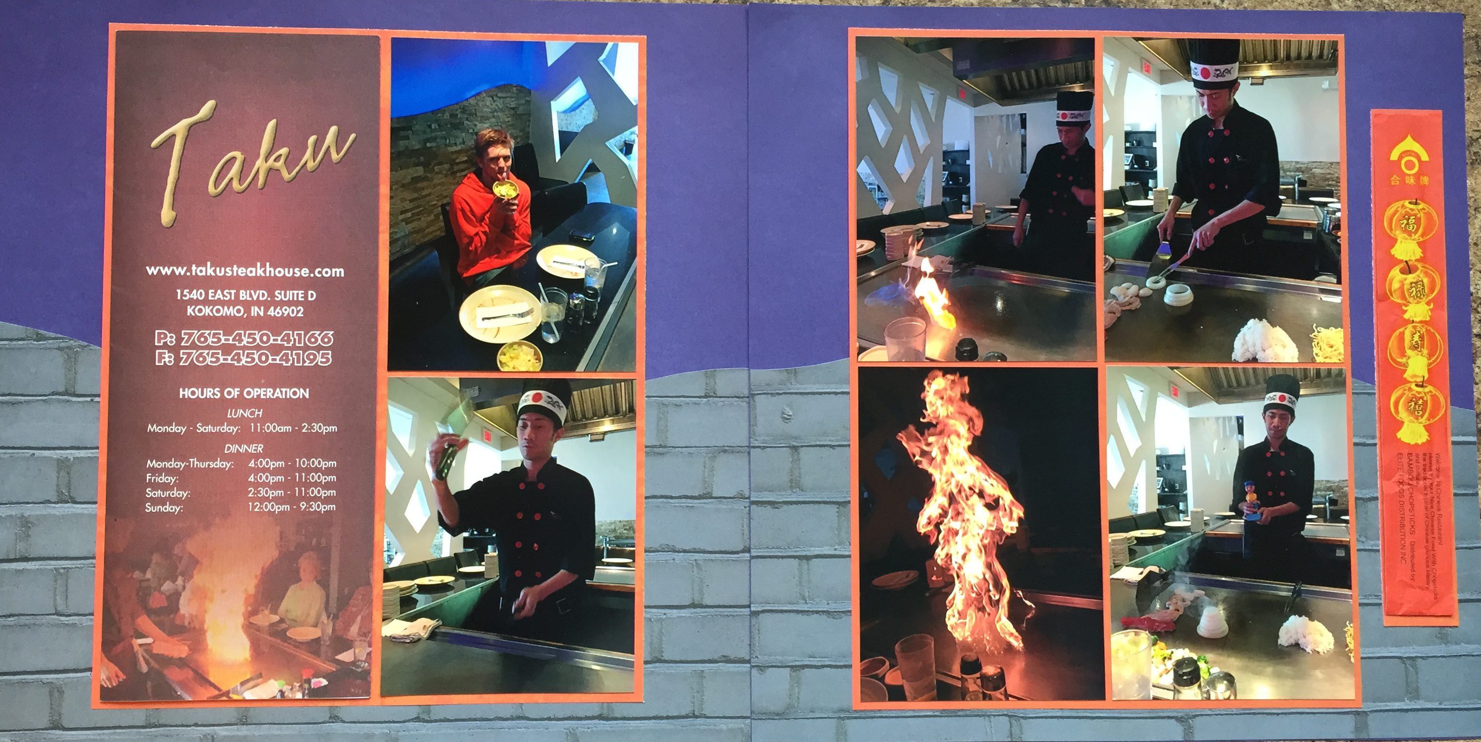 The color scheme for this layout is based on the colors in the restaurant. If you look at the top left hand picture you can see the stone wall and purple painted wall. I duplicated this design with two different scrapbook papers, and it is my favorite part of this page. I then used orange borders to match the menu and chopstick paper wrapper that are the ephemera on the page.