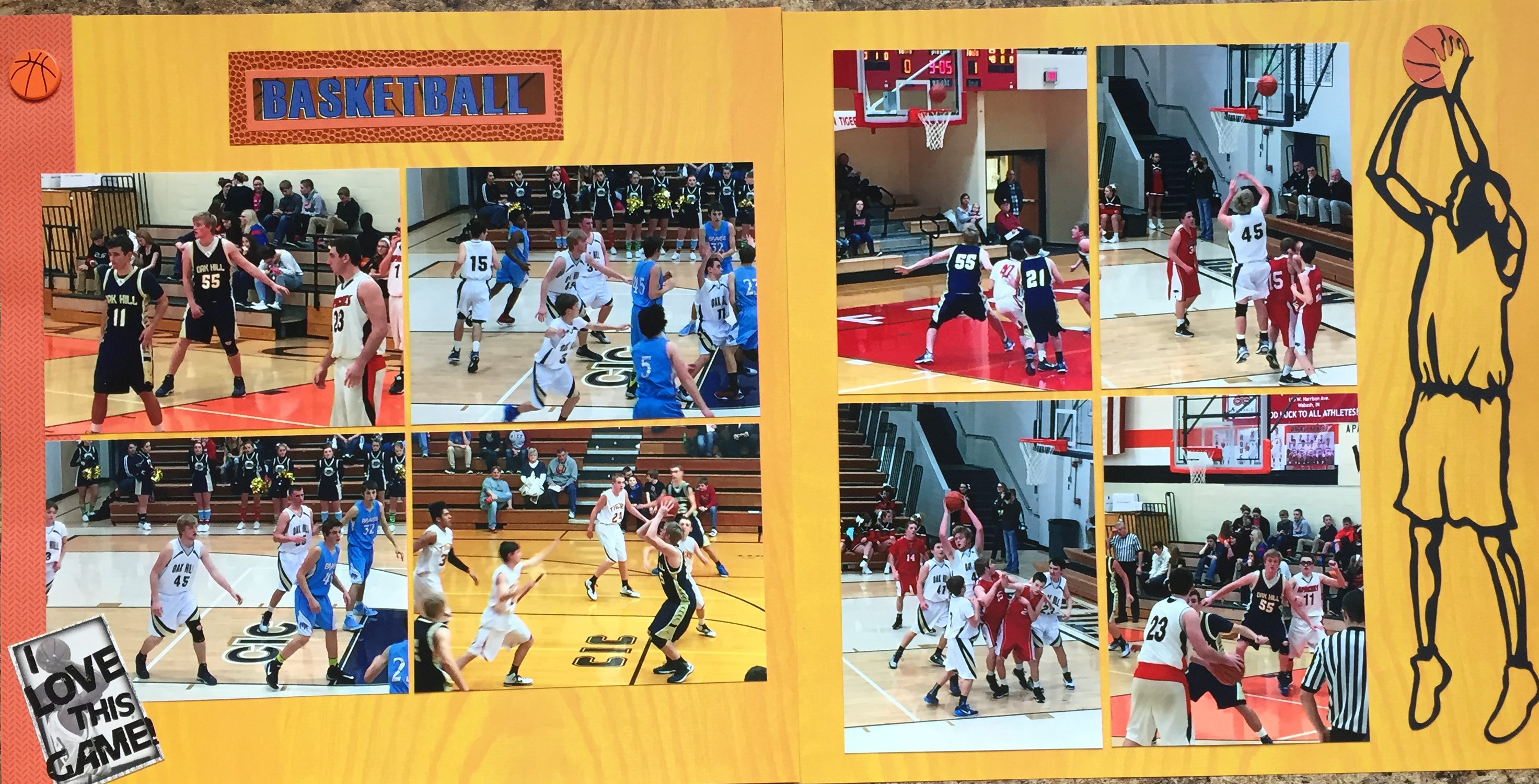 This was my son’s second year of High School basketball so he played on JV and mostly watched the varsity games 🙂 – but the Varsity team won the conference championship which was quite exciting. There are three spreads in this post, all highlighting the basketball season. For the spread above I chose pictures from a variety of games and put them all on the same page. I used a yellow wood grained paper for the background reminiscent of the wooden basketball court floor. The cutout was done on my Cricut machine, and very carefully glued to the page.