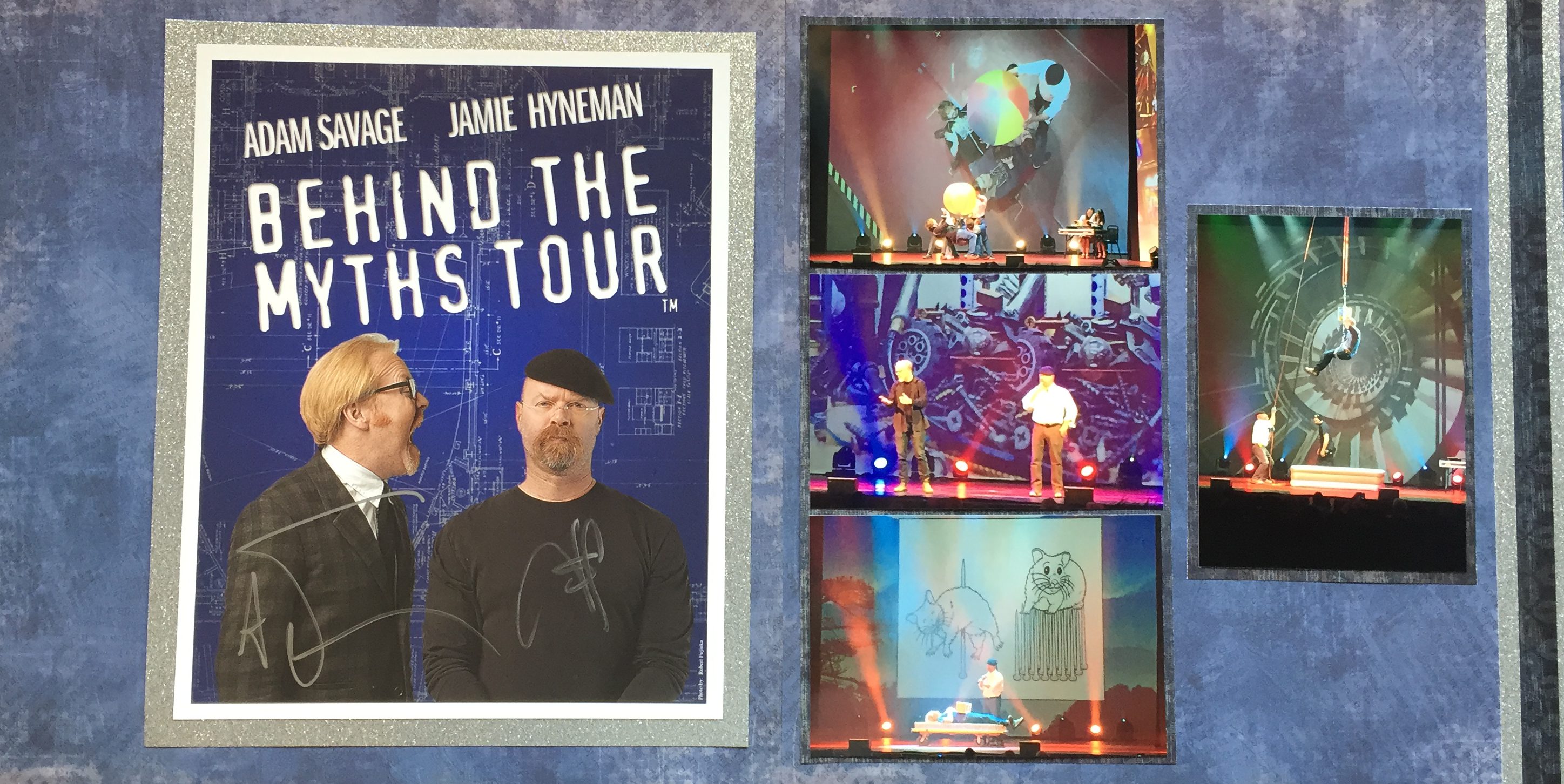 This second spread shares our signed photograph of Adam and Jamie and some pictures I took during the show. The guys did an amazing job of being entertaining, fun, and educational all at the same time – but what else would you expect from these two!? For the background of this paper I chose an industrial themed blue background which complements the background of the autographed pictures, as well as the backdrop to the stage show.