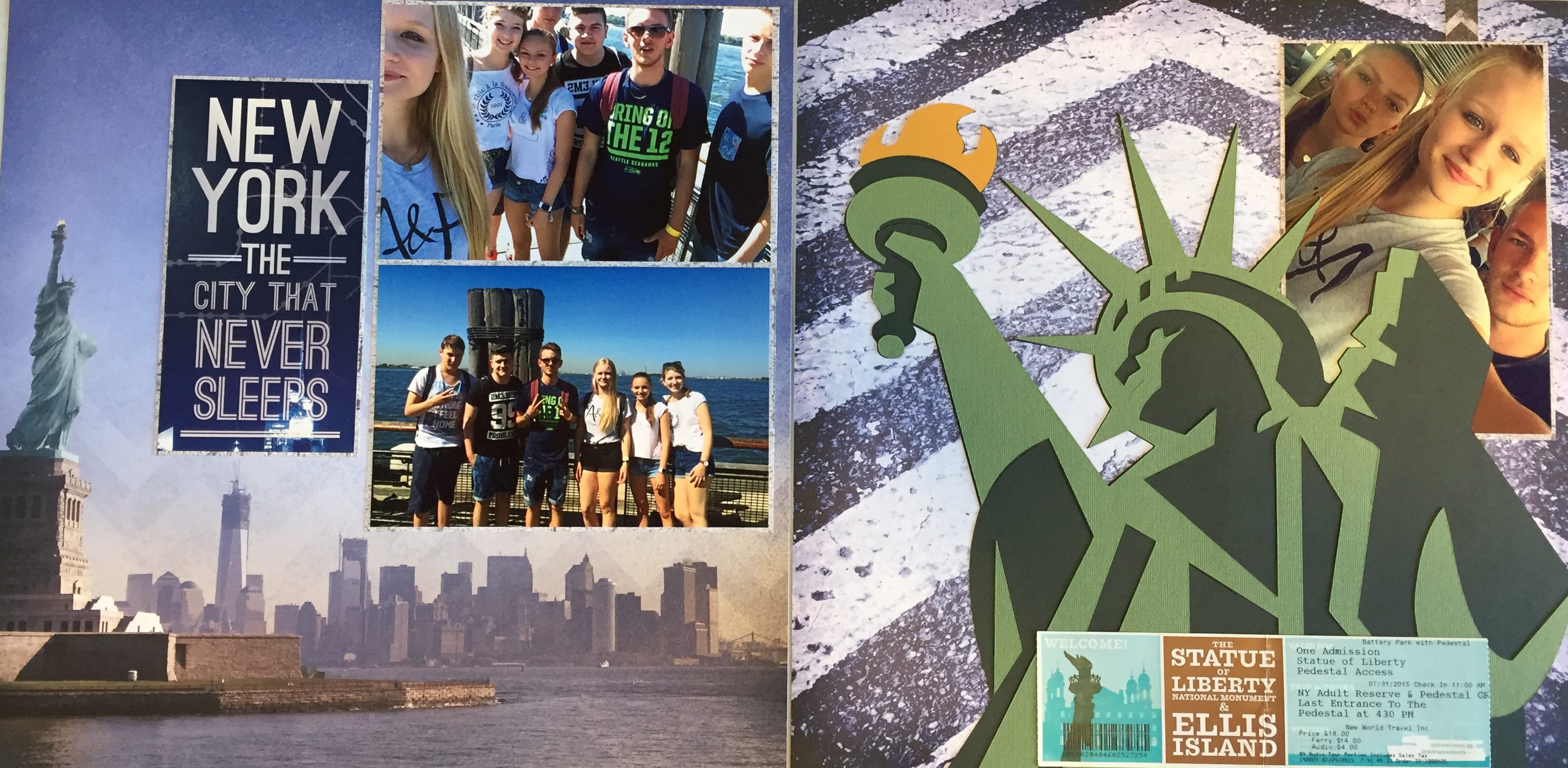 Another day trip that Henry made was to Ellis Island. I think that they wanted to go inside the Statue of Liberty, but that all of the tickets for that day had been sold. I had a background page of the Statue of Liberty already left over from another trip and it worked great for this spread (left hand side). On the right hand side I used some road background paper and put a paper cut (made with my Cricut machine) on top of it. This bold piece helps to define the location of this adventure and makes a strong visual statement. In order to fit all of the pictures without overpowering the paper cutout, I put a photograph behind the cutout. I also used very thin borders around the pictures so as to not take away from the amazing New York skyline background paper.