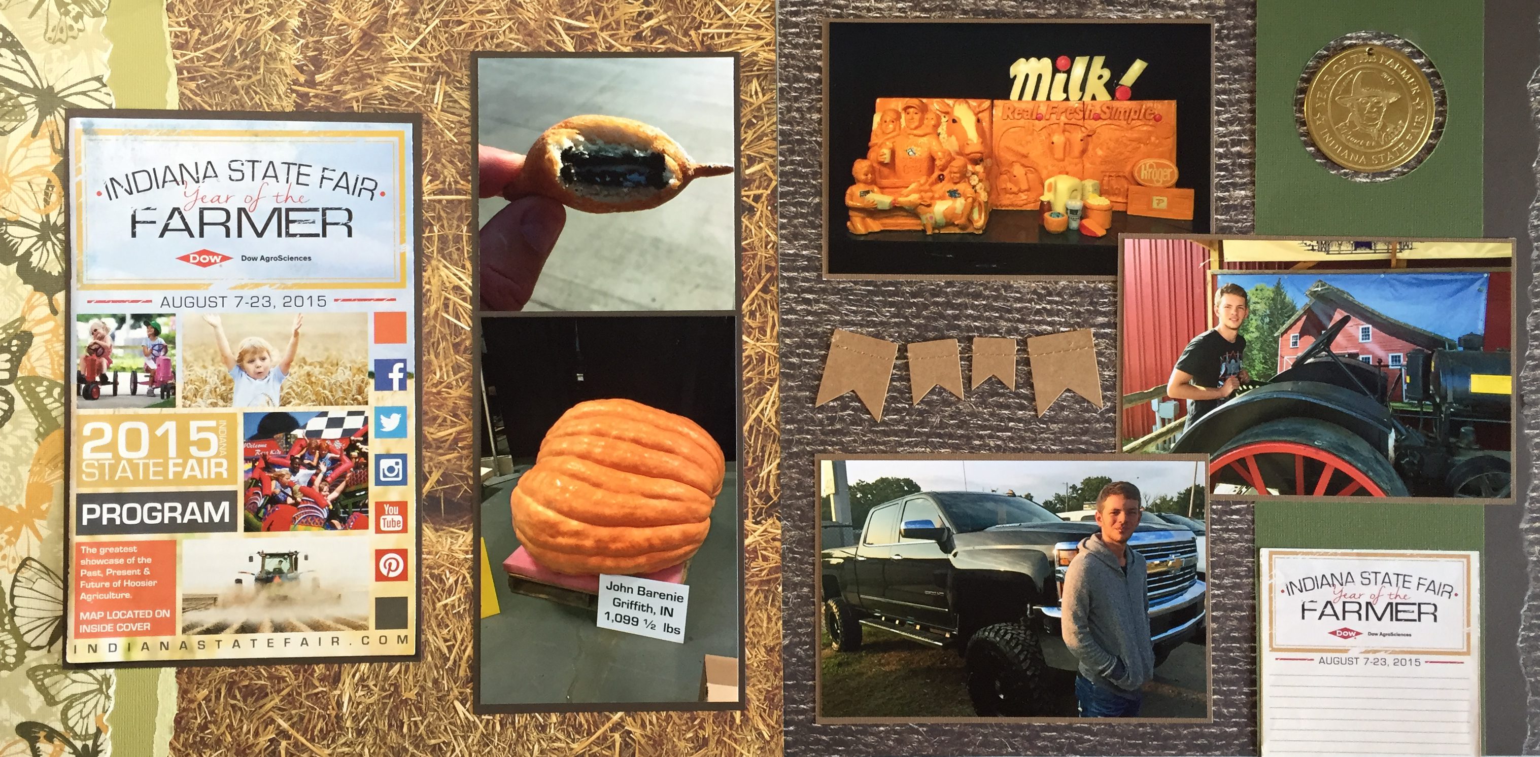 This page has so many things on it! So lets start with the background papers that I used – a bale of hay and burlap! Both things that make me think of farming – and the theme for this year was “The Year of the Farmer”. Starting on the left we have the program cover – the book was too thick to put in the album, so I took the cover off and mounted it directly onto the plastic page protector so that the viewer could open it to read it.