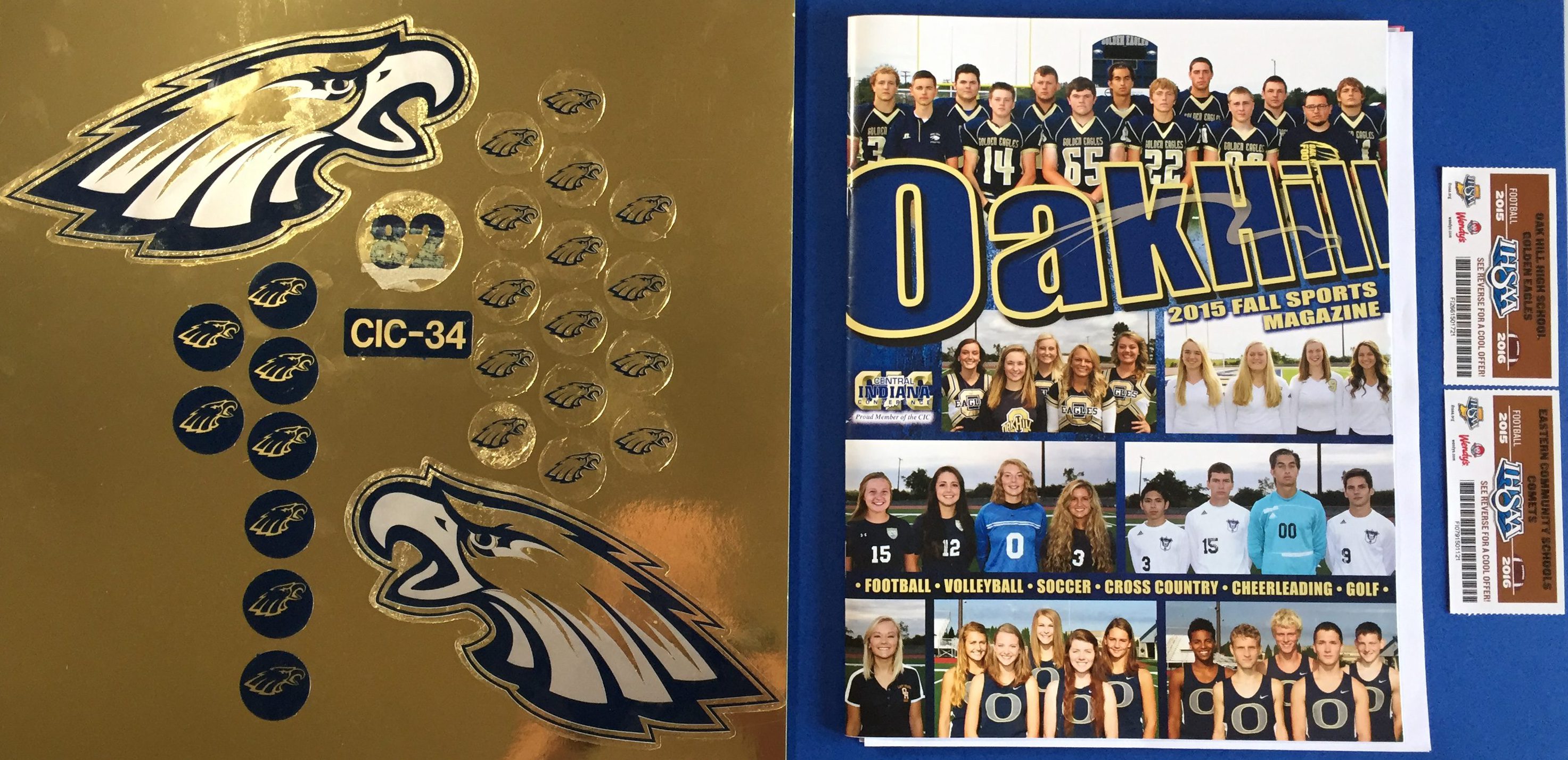 It seems like I scrapbook a lot of football pages! Today’s blog features 4 spreads that I made for our exchange student, Henry for the Fall 2015 football season. The above spread features the official team photograph and other photographs that I took myself on media day. The school colors are blue and gold, and you will see that reflected throughout these four spreads. I found the Golden Eagles sticker at a local print shop in the “clearance” section which was awesome. I think that they are meant to be car window stickers, but I thought that it would work nicely on this page. Be careful if putting a sticker like this on a page – because it will be impossible to re-position it if you don’t get it in the right spot.