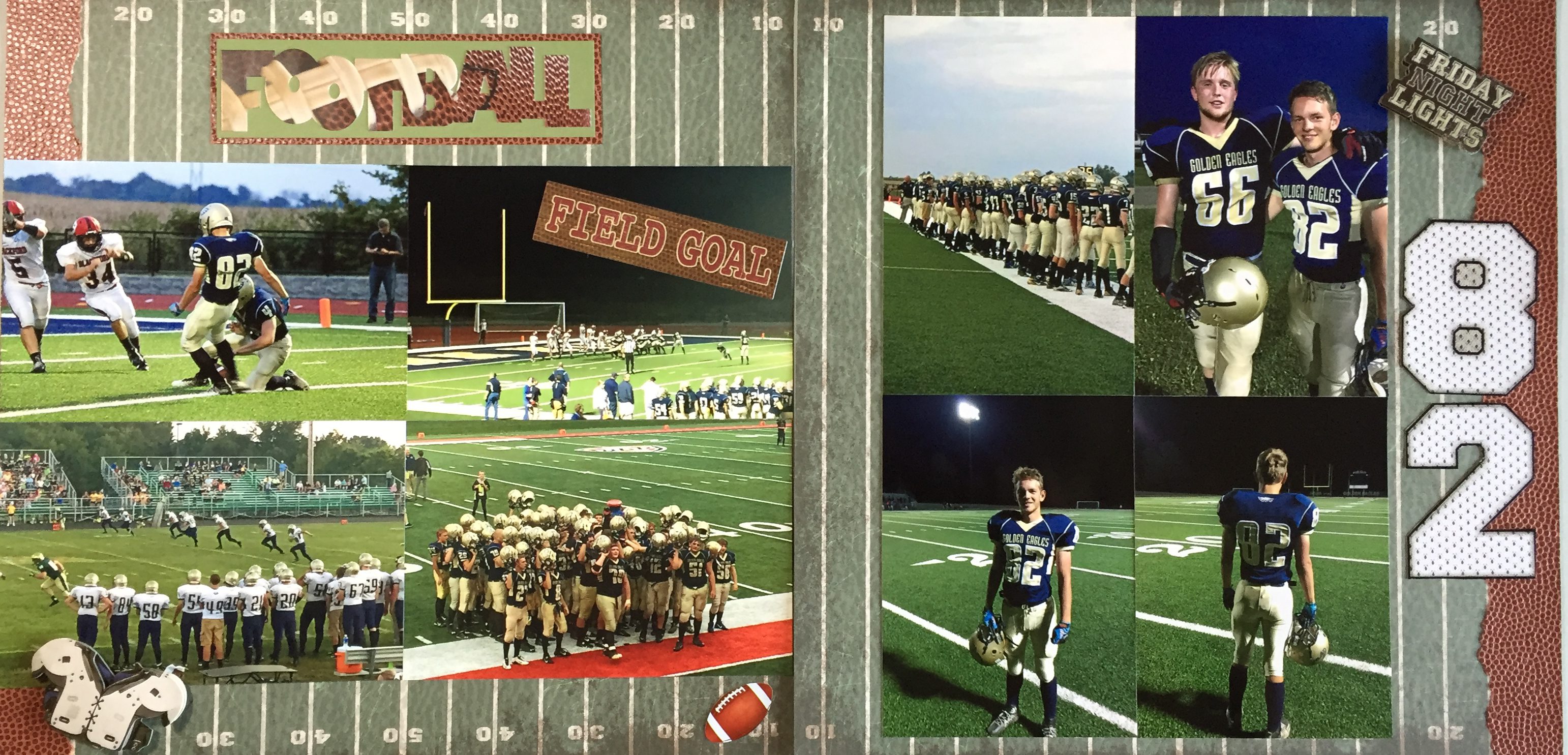This spread features pictures from games and from after the games. The bottom right hand photograph was taken after the last game played on our home field and is kind of sad seeing Henry looking out over a field that he has played on for the last time. The background for this page is football field lines, with end borders made of pigskin. I carefully cut the “82” out of a page of athletic numbers to add to the border.