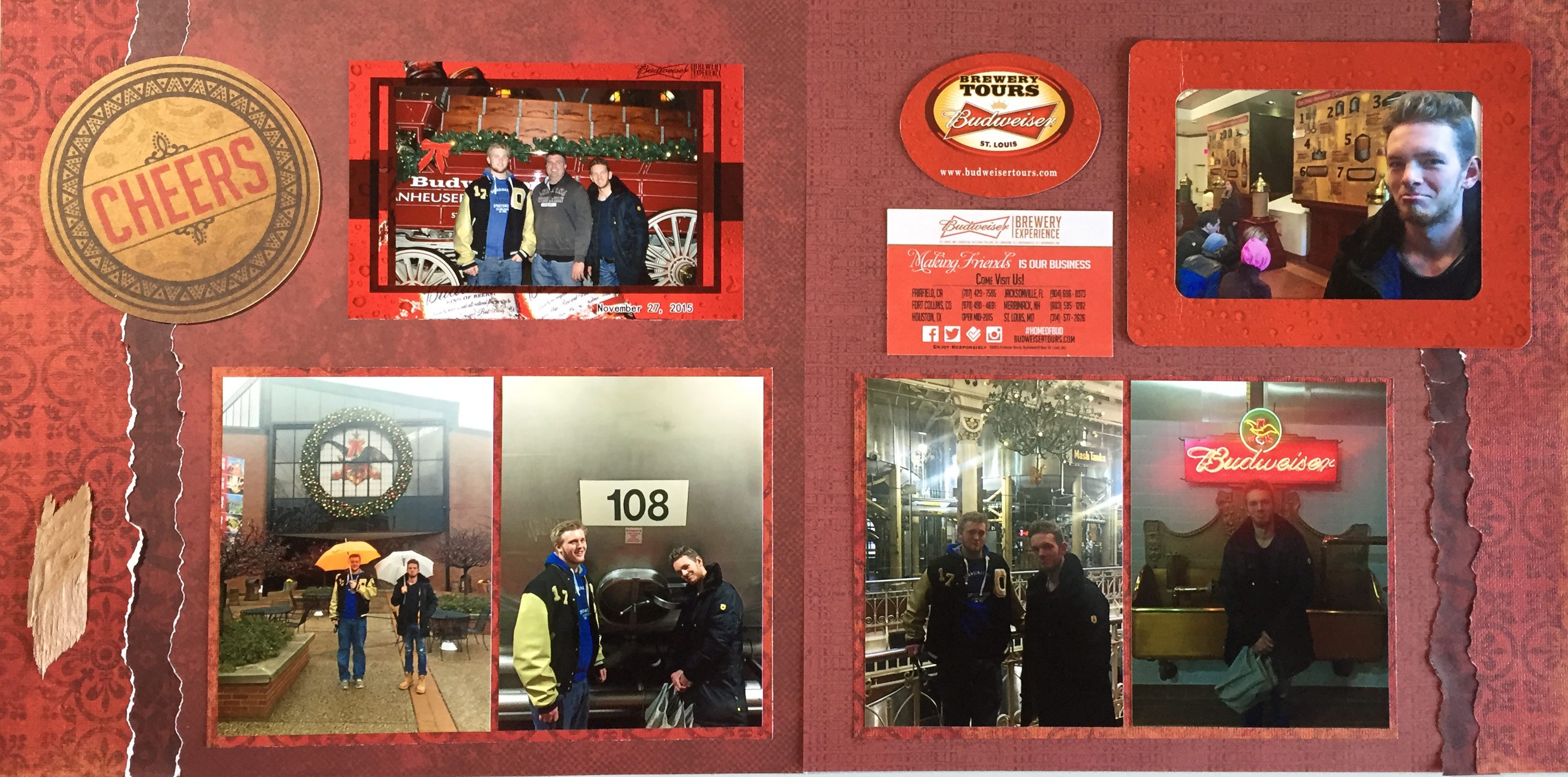 For this spread I had to use red paper to match the logo of the Brewery, and had fun with the ephemera that I collected on this trip – there is a piece of beechwood used in the fermentation process (picked up in the massive fermentation room), a coaster from the biergarten at the end of the tour, our ticket for the tour (By the way – it is free!), and magnetic borders for the photographs that I purchased from the tour.